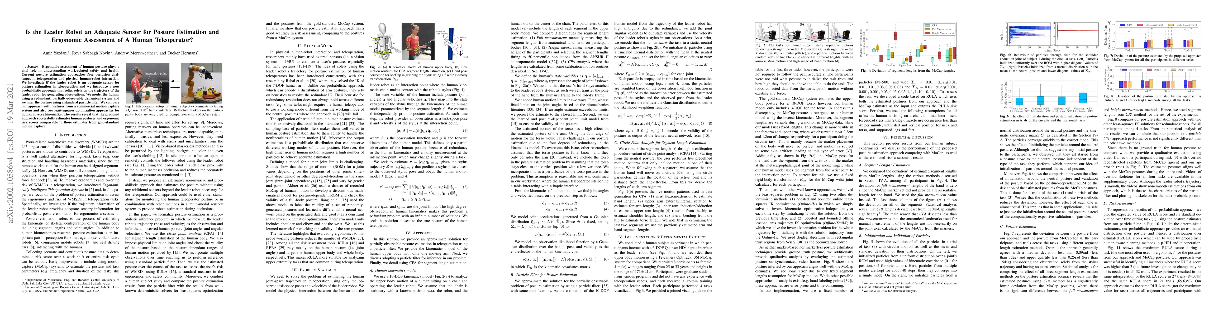 This study investigates the efficacy of a leader robot as a sensor for estimating human posture in teleoperation. It introduces a probabilistic method based on leader robot trajectory to infer human postures using a particle filter, showing comparable results to a commercial motion capture system.