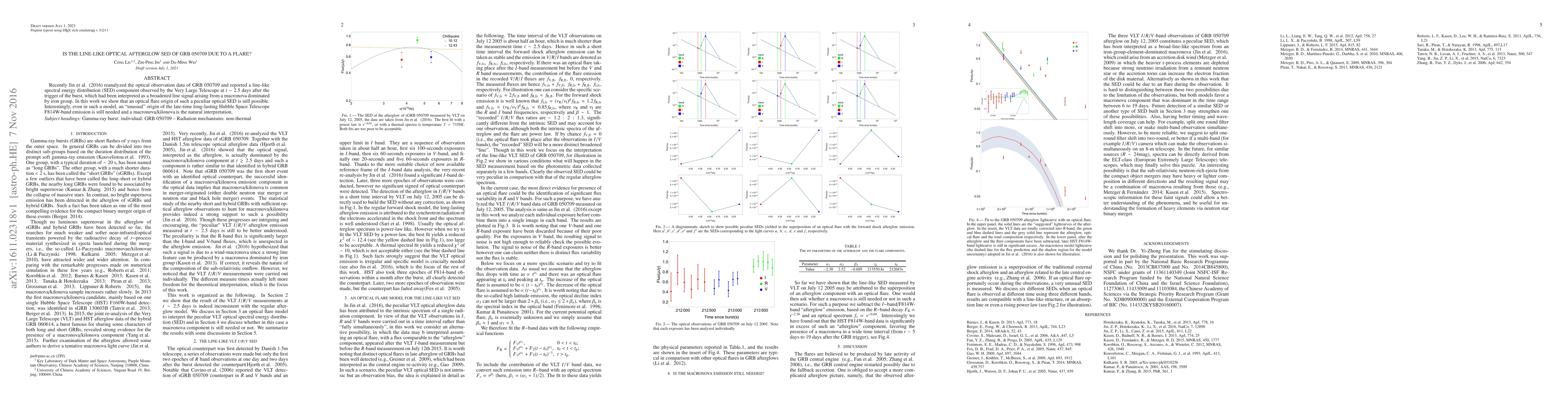 The research reanalyzed optical observation data of GRB 050709, focusing on a line-like SED component observed by VLT at ~2.5 days post-burst, initially interpreted as a macronova dominated by iron group elements. The authors propose an alternative model attributing the peculiar optical SED to an optical flare, with flux comparable to the 'afterglow' component, appearing after the I-band measurement but before the R and V band measurements.
