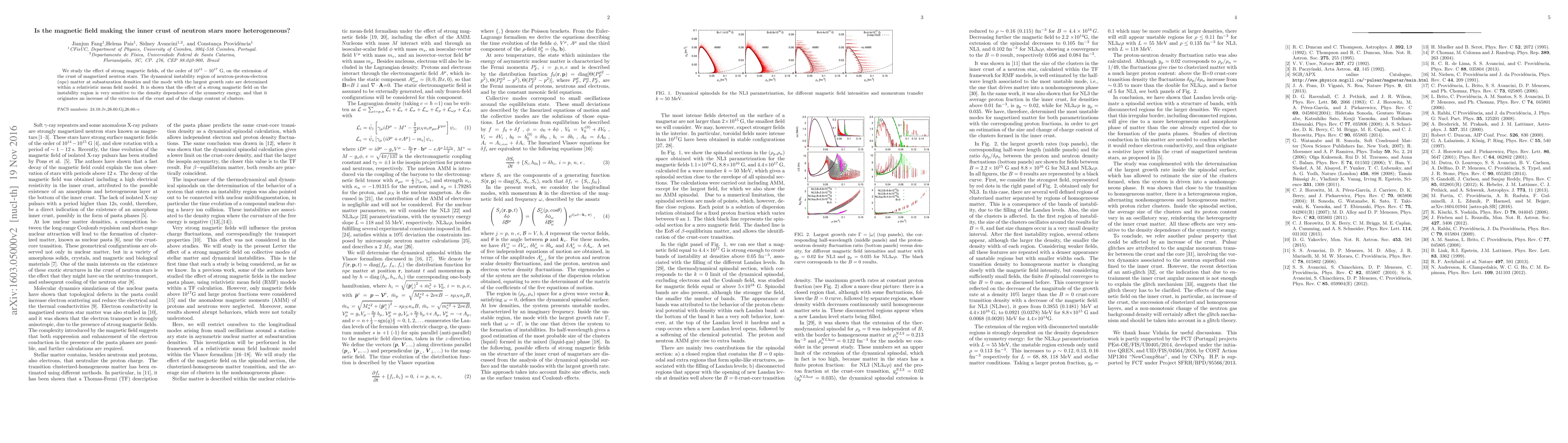 We study the effect of strong magnetic fields, of the order of $10^{15}-10^{17}$ G, on the extension of the crust of magnetized neutron stars. The dynamical instability region of neutron-proton-electron ($npe$) matter at subsaturation densities and the mode with the largest growth rate are determined within a relativistic mean field model. It is shown that a strong magnetic field has a large effect on the instability region, defining the crust-core transition as a wide density range.