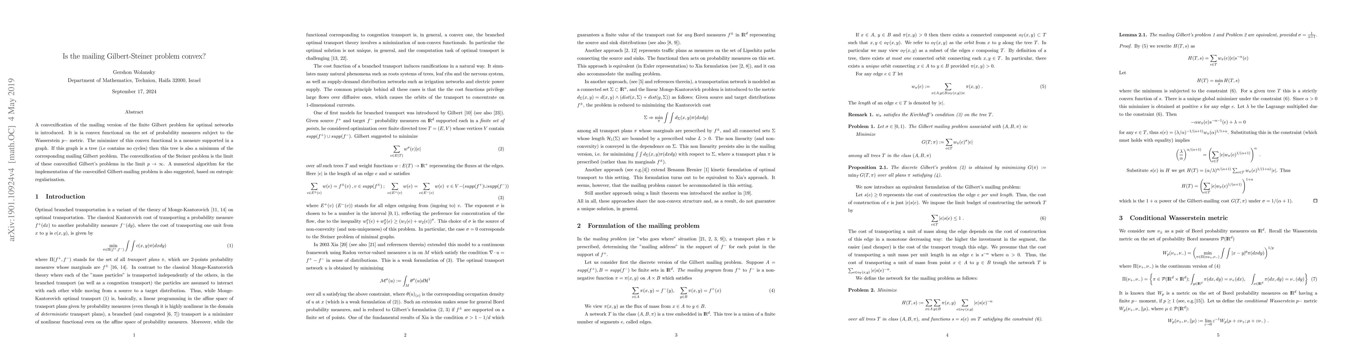 A new method for solving the mailing Gilbert problem optimizes over a convex functional using Wasserstein distance, with the solution set supported in a graph that is also a minimum for tree graphs.