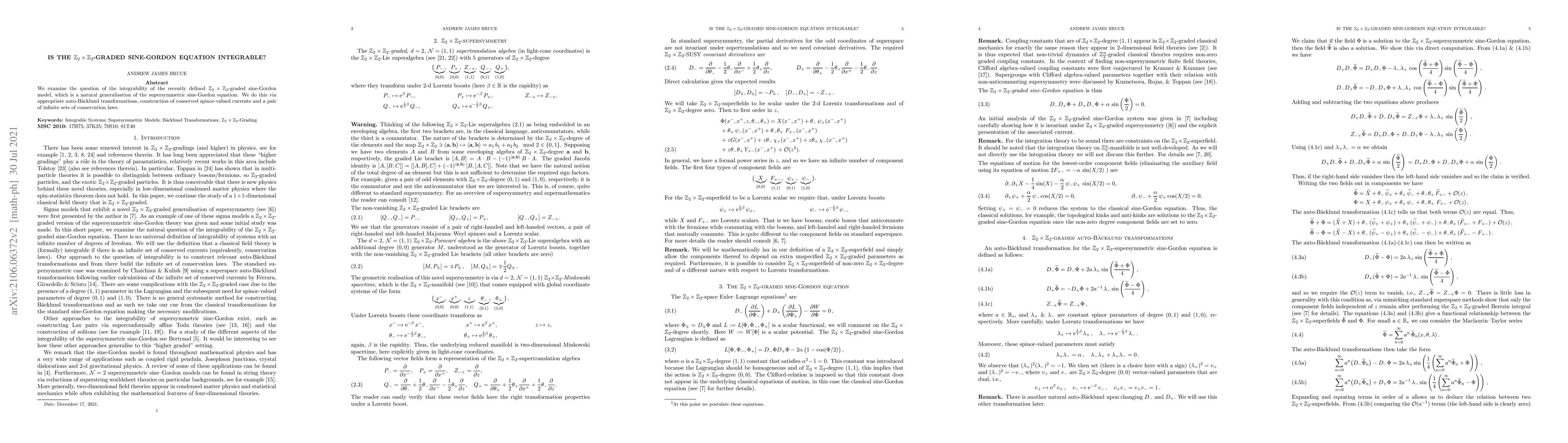 We examine the question of the integrability of the recently defined $\mathbb{Z}_2\times \mathbb{Z}_2$-graded sine-Gordon model, which is a natural generalisation of the supersymmetric sine-Gordon equation. We do this via appropriate auto-B\"{a}cklund transformations, construction of conserved spinor-valued currents and a pair of infinite sets of conservation laws.
