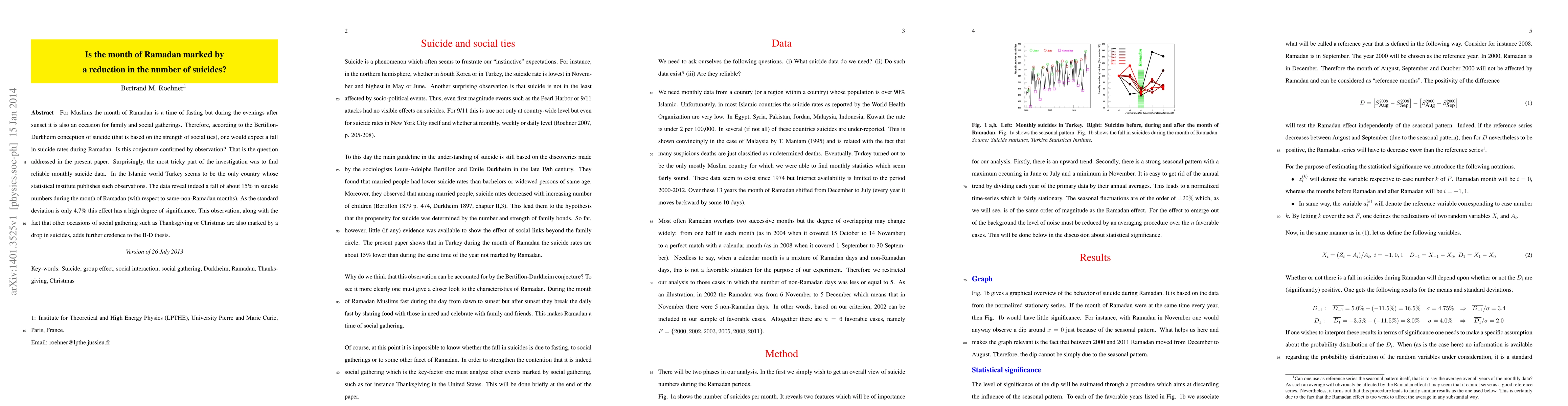 For Muslims the month of Ramadan is a time of fasting but during the evenings after sunset it is also an occasion for family and social gatherings. Therefore, according to the Bertillon-Durkheim conception of suicide (that is based on the strength of social ties), one would expect a fall in suicide rates during Ramadan. Is this conjecture confirmed by observation? That is the question addressed in the present paper. Surprisingly, the most tricky part of the investigation was to find reliable monthly suicide data. In the Islamic world Turkey seems to be the only country whose statistical institute publishes such observations. The data reveal indeed a fall of about $15\%$ in suicide numbers during the month of Ramadan (with respect to same-non-Ramadan months). As the standard deviation is only $4.7\%$ this effect has a high degree of significance. This observation, along with the fact that other occasions of social gathering such as Thanksgiving or Christmas are also marked by a drop in suicides, adds further credence to the B-D thesis.