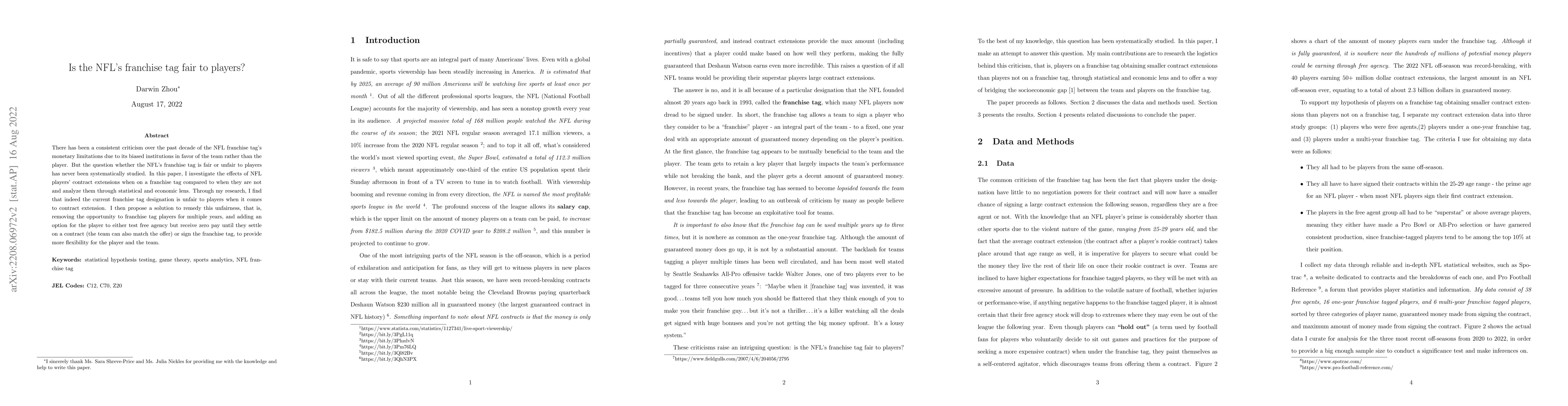 This paper investigates the fairness of the NFL's franchise tag, finding it imposes unfair monetary limitations on players due to institutional biases favoring teams. The author proposes a solution by limiting multiple-year franchise tags and offering players the choice to test free agency or accept the tag with more flexibility.