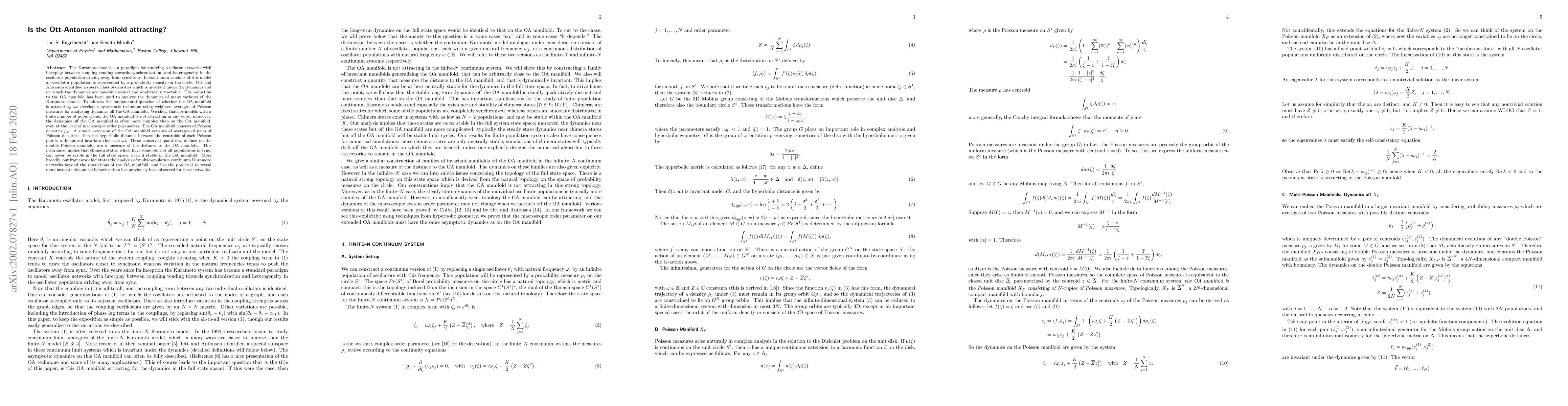 The Kuramoto model is a paradigm for studying oscillator networks with interplay between coupling tending towards synchronization, and heterogeneity in the oscillator population driving away from synchrony. In continuum versions of this model an oscillator population is represented by a probability density on the circle. Ott and Antonsen identified a special class of densities which is invariant under the dynamics and on which the dynamics are low-dimensional and analytically tractable. The reduction to the OA manifold has been used to analyze the dynamics of many variants of the Kuramoto model. To address the fundamental question of whether the OA manifold is attracting, we develop a systematic technique using weighted averages of Poisson measures for analyzing dynamics off the OA manifold. We show that for models with a finite number of populations, the OA manifold is {\it not} attracting in any sense; moreover, the dynamics off the OA manifold is often more complex than on the OA manifold, even at the level of macroscopic order parameters. The OA manifold consists of Poisson densities $\rho_\omega$. A simple extension of the OA manifold consists of averages of pairs of Poisson densities; then the hyperbolic distance between the centroids of each Poisson pair is a dynamical invariant (for each $\omega$). These conserved quantities, defined on the double Poisson manifold, are a measure of the distance to the OA manifold. This invariance implies that chimera states, which have some but not all populations in sync, can never be stable in the full state space, even if stable in the OA manifold. More broadly, our framework facilitates the analysis of multi-population continuum Kuramoto networks beyond the restrictions of the OA manifold, and has the potential to reveal more intricate dynamical behavior than has previously been observed for these networks.