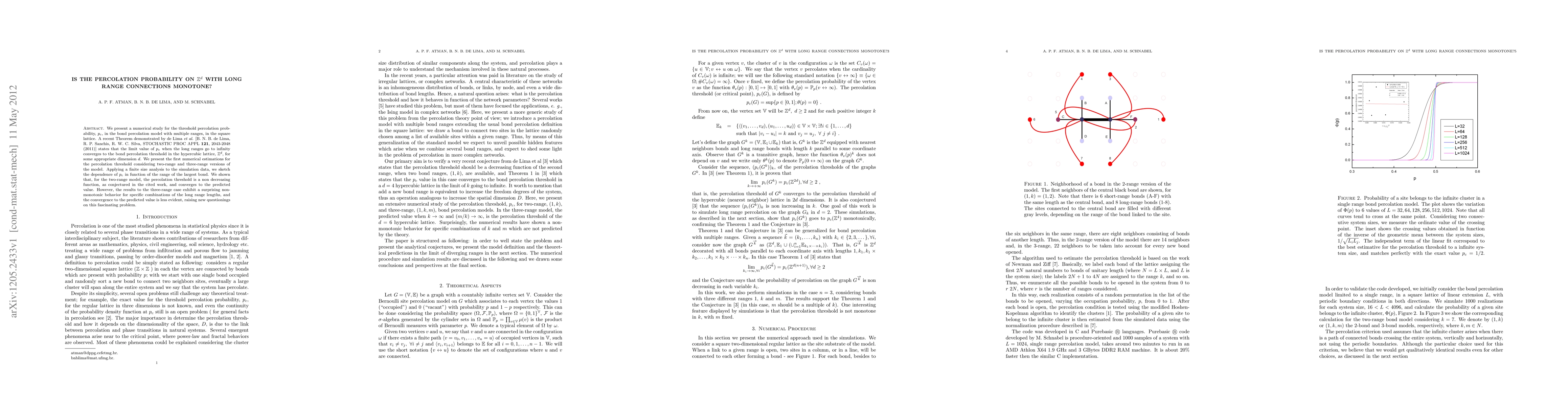 We present a numerical study for the threshold percolation probability, $p_c$, in the bond percolation model with multiple ranges, in the square lattice. A recent Theorem demonstrated by de Lima {\it et al.} [B. N. B. de Lima, R. P. Sanchis, R. W. C. Silva, STOCHASTIC PROC APPL {\bf 121}, 2043-2048 (2011)] states that the limit value of $p_c$ when the long ranges go to infinity converges to the bond percolation threshold in the hypercubic lattice, $\mathbb{Z}^d$, for some appropriate dimension $d$. We present the first numerical estimations for the percolation threshold considering two-range and three-range versions of the model. Applying a finite size analysis to the simulation data, we sketch the dependence of $p_c$ in function of the range of the largest bond. We shown that, for the two-range model, the percolation threshold is a non decreasing function, as conjectured in the cited work, and converges to the predicted value. However, the results to the three-range case exhibit a surprising non-monotonic behavior for specific combinations of the long range lengths, and the convergence to the predicted value is less evident, raising new questionings on this fascinating problem.