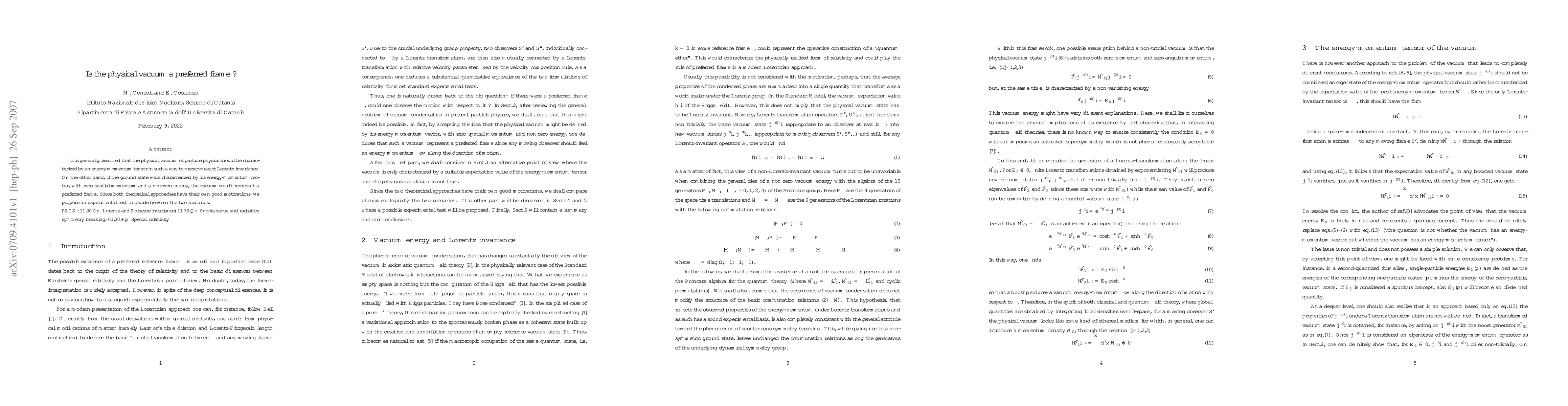 Researchers propose a test to determine if the physical vacuum is a preferred frame, with either zero energy-momentum vector or non-zero energy but zero spatial momentum.