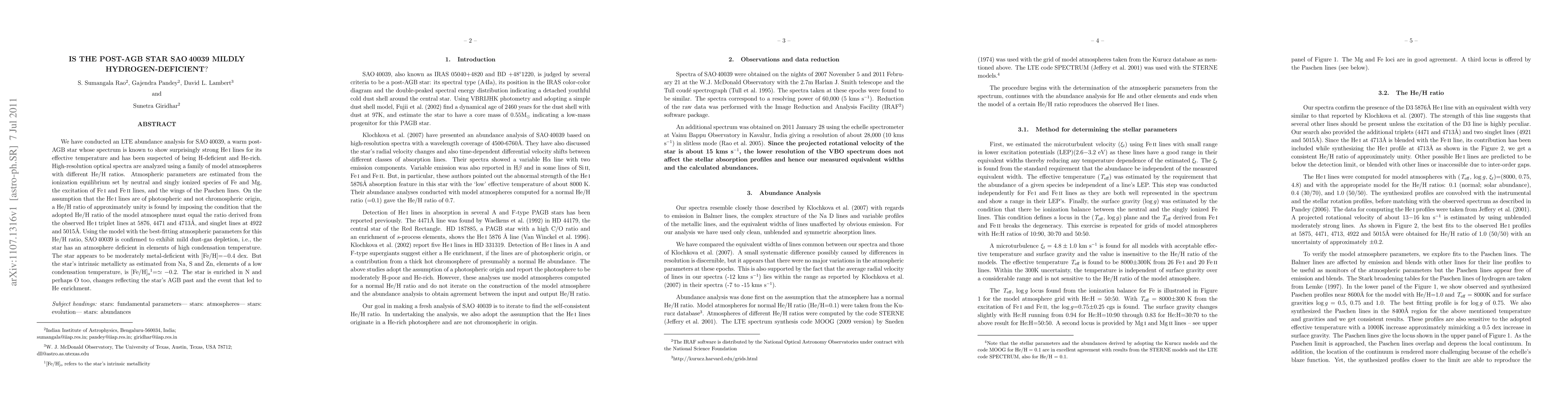 SAO 40039, a post-AGB star, exhibits strong He I lines and is suspected of being H-deficient and He-rich. Analysis reveals a He/H ratio of approximately unity, confirming mild H-deficiency and moderate dust-gas depletion, with intrinsic metallicity suggesting enrichment in N and possibly O.