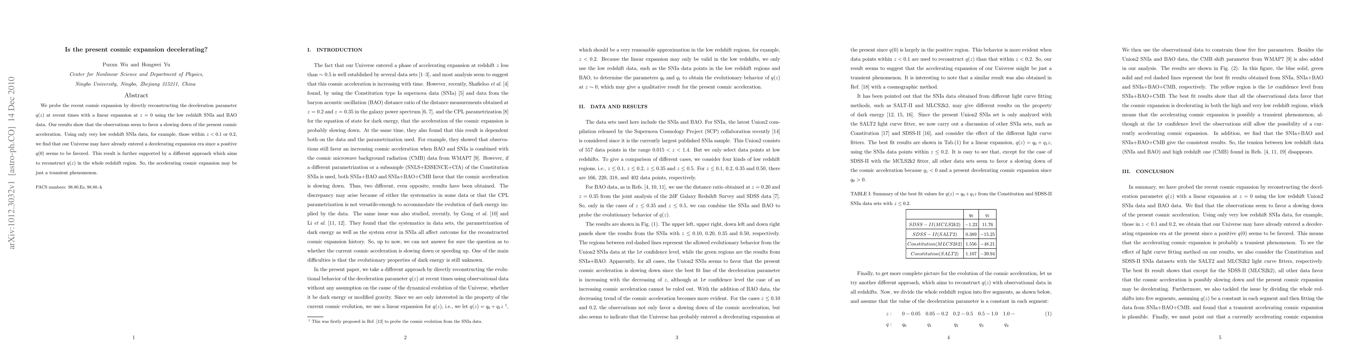 This study reconstructs the deceleration parameter $q(z)$ using low redshift SNIa and BAO data, suggesting that the present cosmic expansion may be slowing down. The analysis indicates a possible transition from acceleration to deceleration, implying that the current expansion phase might be transient.