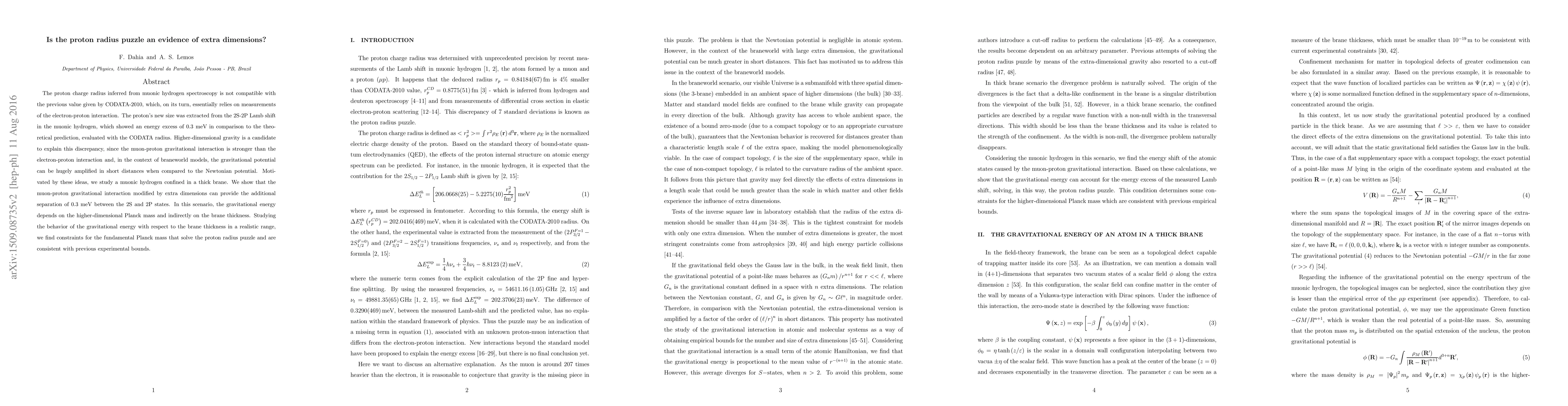 The proton radius puzzle, arising from a discrepancy in measurements of the proton's charge radius, may be explained by higher-dimensional gravity, suggesting that extra dimensions could amplify the gravitational interaction between muons and protons, resolving the discrepancy. This is supported by theoretical models involving a thick brane where the gravitational energy depends on the higher-dimensional Planck mass.