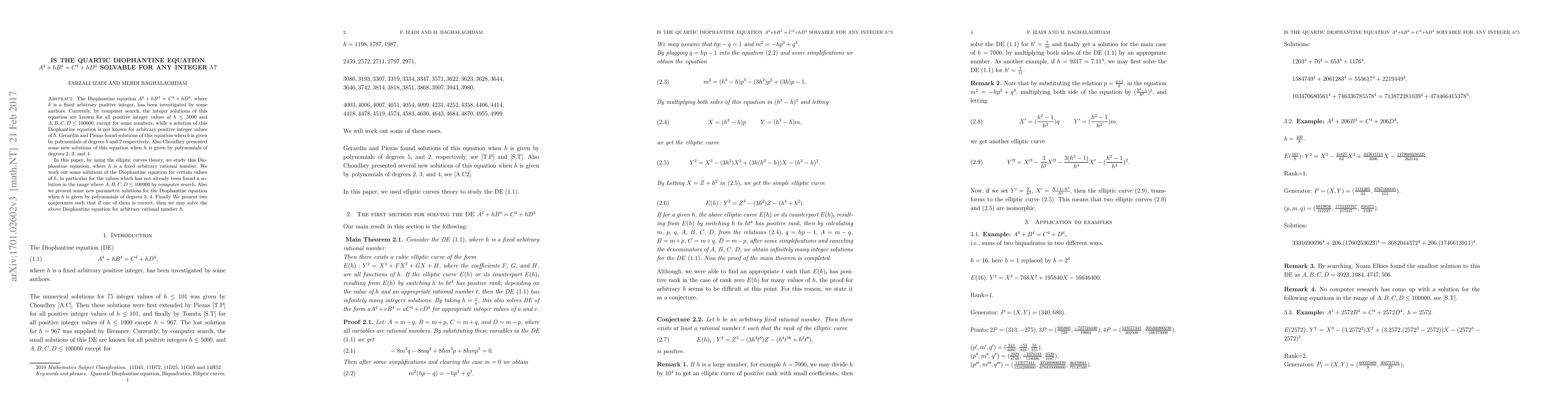 This paper investigates the solvability of a quartic Diophantine equation using elliptic curves theory, finding solutions for certain values of h and presenting new parametric solutions, as well as two conjectures that could lead to solving the equation for arbitrary rational h.