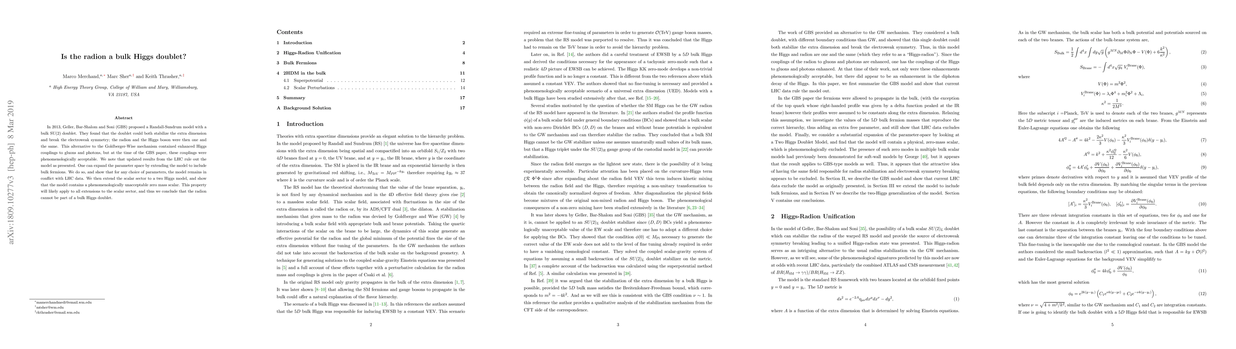 The paper investigates the Geller-Bar-Shalom-Soni (GBS) model, which proposed a Randall-Sundrum setup with a bulk SU(2) doublet. Initially promising due to its ability to stabilize the extra dimension and break electroweak symmetry, the model is found to conflict with updated LHC data. Extensions to the model, including bulk fermions and a two Higgs model, do not resolve the issue, as they still result in phenomenologically unacceptable outcomes, like a zero mass scalar. The authors conclude that the radion cannot be part of a bulk doublet.