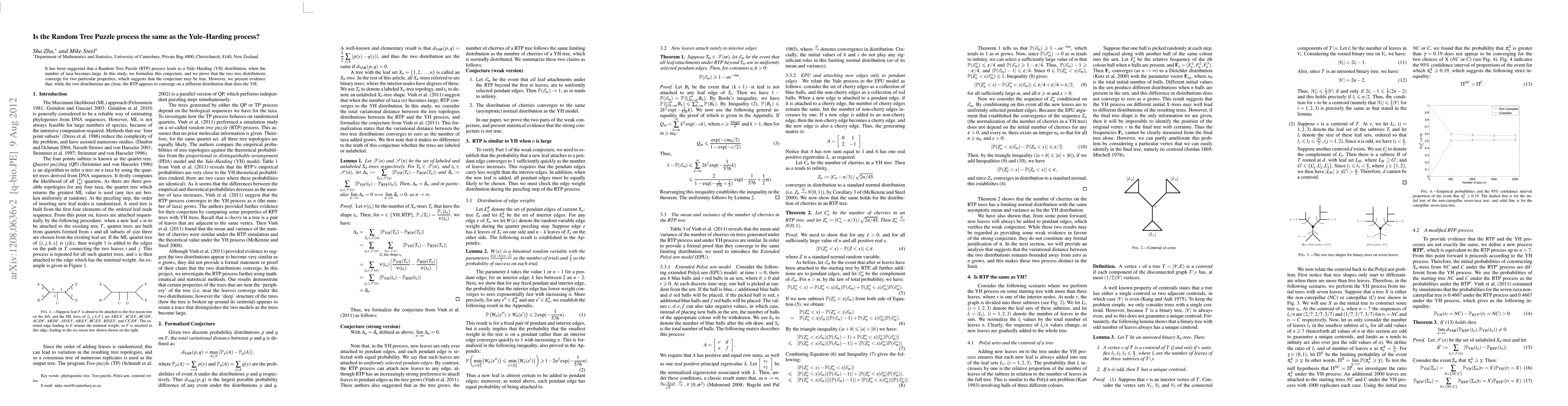 This study formalizes the conjecture that the Random Tree Puzzle (RTP) process leads to a Yule-Harding (YH) distribution as the number of taxa increases. While the two tree distributions converge for certain properties, evidence suggests that the RTP converges to a different distribution than the YH.