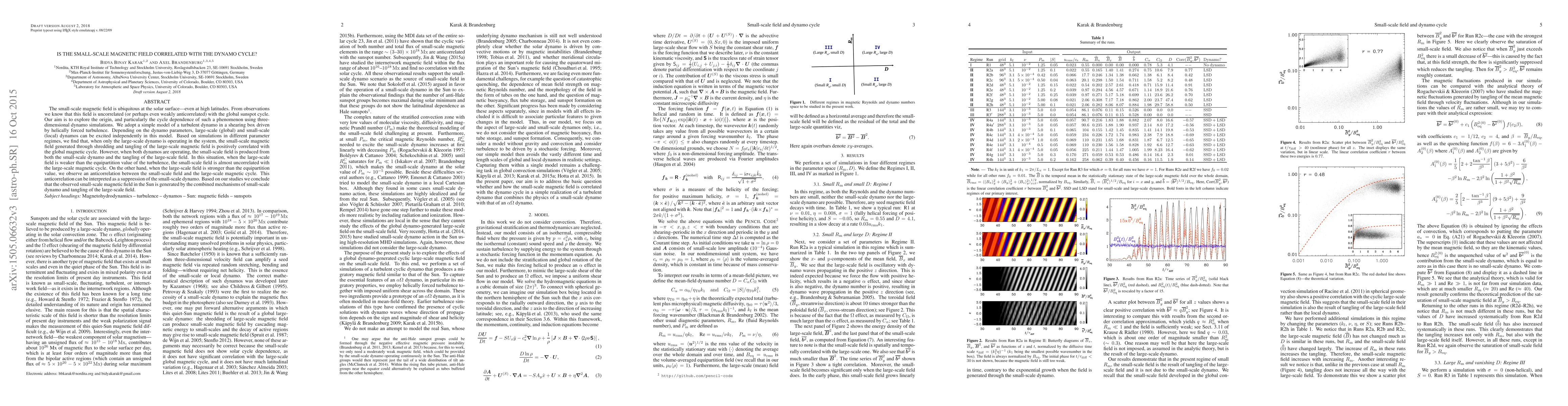 This paper investigates the correlation between small-scale magnetic fields and the global dynamo cycle using three-dimensional dynamo simulations. It finds that small-scale fields are uncorrelated with the global cycle when both large-scale and small-scale dynamos operate, especially when the large-scale field is weaker than the equipartition value of turbulence.