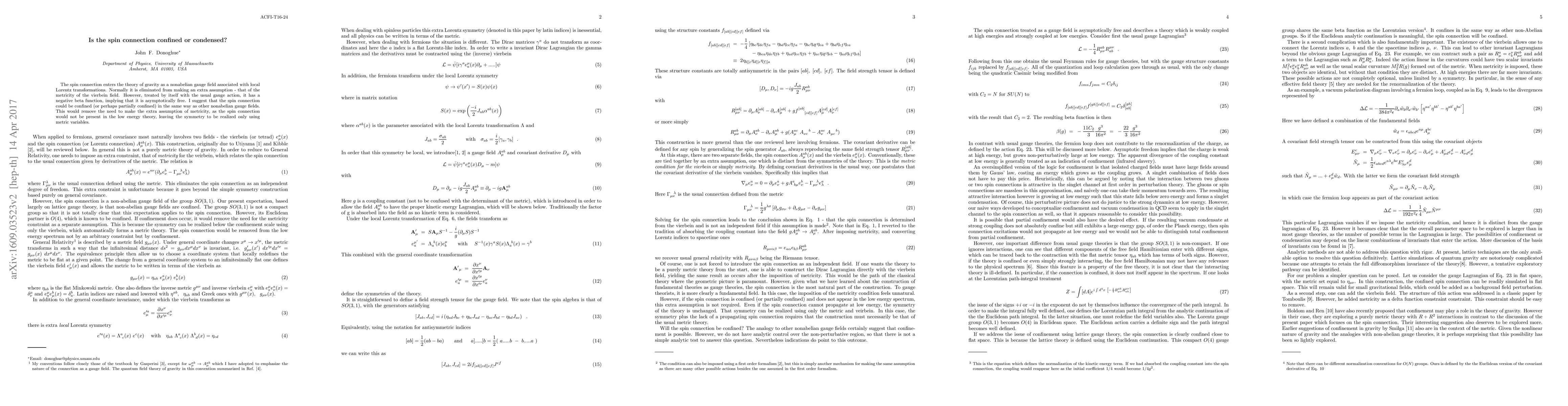 The spin connection enters the theory of gravity as a nonabelian gauge field associated with local Lorentz transformations. Normally it is eliminated from making an extra assumption - that of the metricity of the vierbein field. However, treated by itself with the usual gauge action, it has a negative beta function, implying that it is asymptotically free. I suggest that the spin connection could be confined (or perhaps partially confined) in the same way as other nonabelian gauge fields. This would remove the need to make the extra assumption of metricity, as the spin connection would not be present in the low energy theory, leaving the symmetry to be realized only using metric variables.