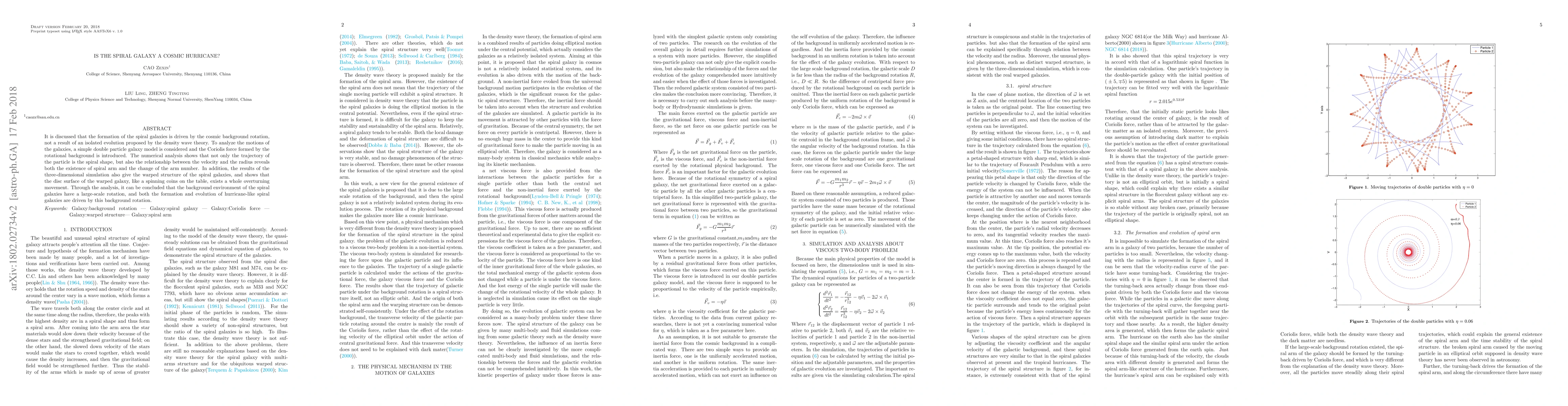 It is discussed that the formation of the spiral galaxies is driven by the cosmic background rotation, not a result of an isolated evolution proposed by the density wave theory. To analyze the motions of the galaxies, a simple double particle galaxy model is considered and the Coriolis force formed by the rotational background is introduced. The numerical analysis shows that not only the trajectory of the particle is the spiral shape, but also the relationship between the velocity and the radius reveals both the existence of spiral arm and the change of the arm number. In addition, the results of the three-dimensional simulation also give the warped structure of the spiral galaxies, and shows that the disc surface of the warped galaxy, like a spinning coins on the table, exists a whole overturning movement. Through the analysis, it can be concluded that the background environment of the spiral galaxies have a large-scale rotation, and both the formation and evolution of hurricane-like spiral galaxies are driven by this background rotation.