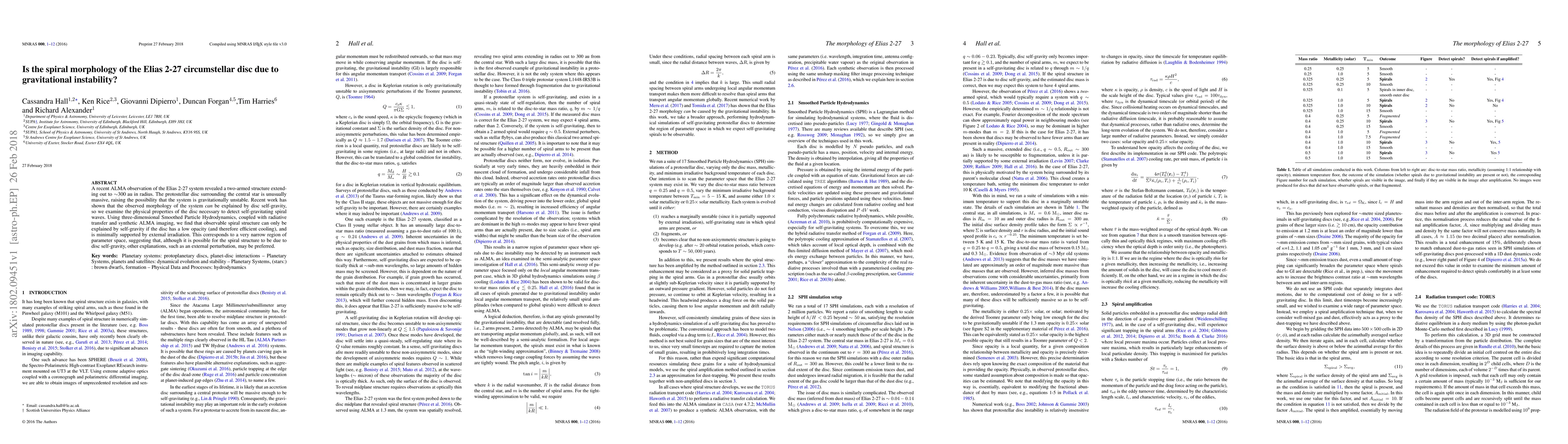 The ALMA observation of the Elias 2-27 system shows a two-armed spiral structure, suggesting gravitational instability. However, simulations suggest that the spiral morphology is more likely due to self-gravity, requiring specific disc properties, which are rare, implying other factors may be at play.