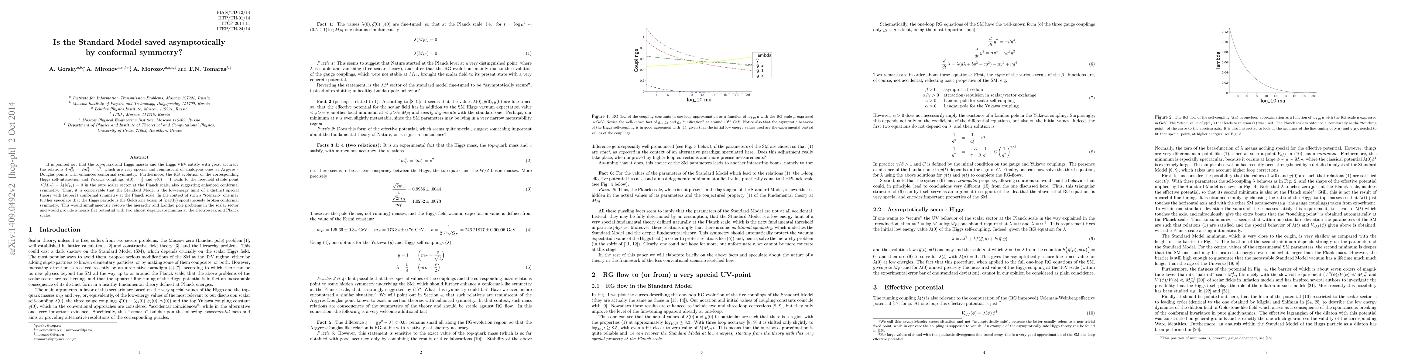 It is pointed out that the top-quark and Higgs masses and the Higgs VEV satisfy with great accuracy the relations 4m_H^2=2m_T^2=v^2, which are very special and reminiscent of analogous ones at Argyres - Douglas points with enhanced conformal symmetry. Furthermore, the RG evolution of the corresponding Higgs self-interaction and Yukawa couplings \lambda(0)=1/8 and y(0)=1 leads to the free-field stable point \lambda(M_Pl)= \dot \lambda(M_Pl)=0 in the pure scalar sector at the Planck scale, also suggesting enhanced conformal symmetry. Thus, it is conceivable that the Standard Model is the low-energy limit of a distinct special theory with (super?) conformal symmetry at the Planck scale. In the context of such a "scenario" one may further speculate that the Higgs particle is the Goldstone boson of (partly) spontaneously broken conformal symmetry. This would simultaneously resolve the hierarchy and Landau pole problems in the scalar sector and would provide a nearly flat potential with two almost degenerate minima at the electroweak and Planck scales.
