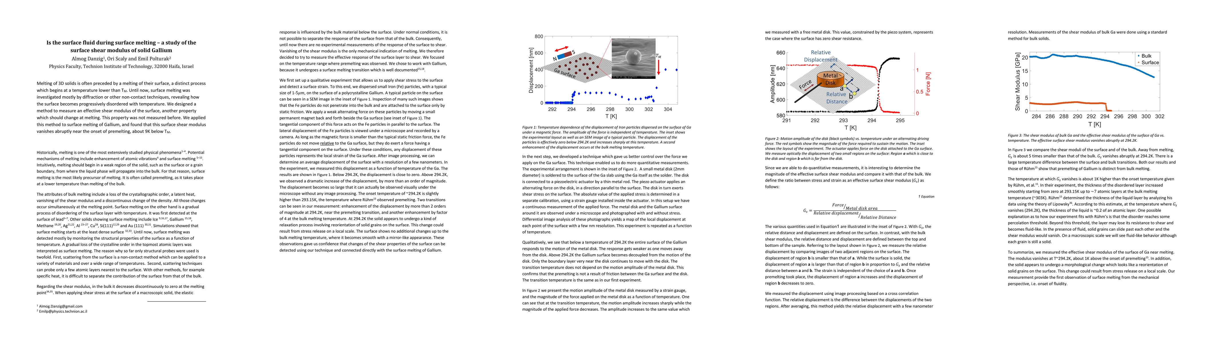 Researchers developed a method to measure surface shear modulus of Gallium during melting and found it vanishes abruptly near the onset of premelting, 9K below melting temperature.