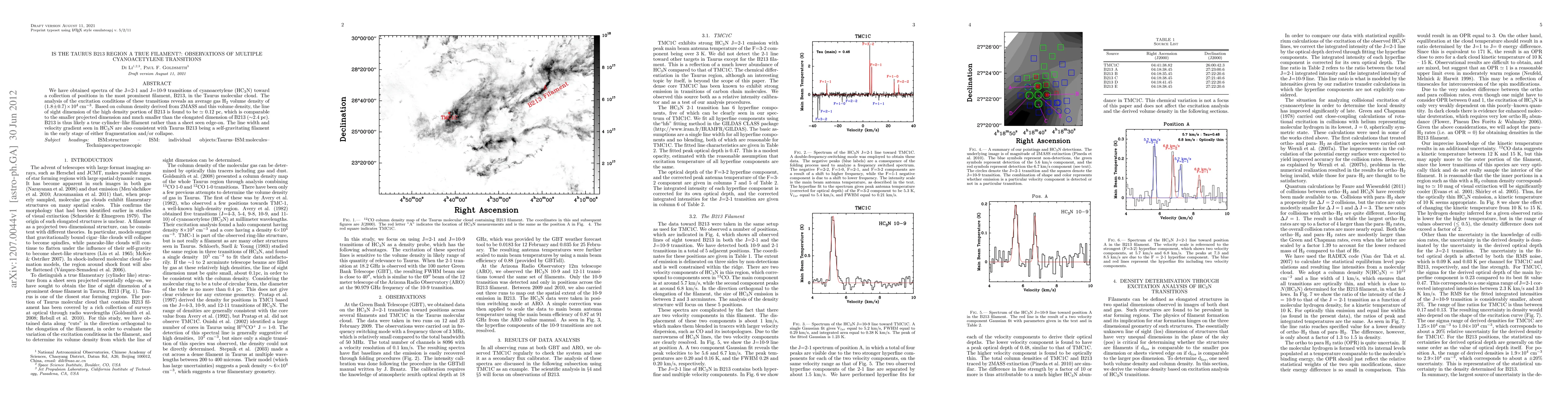 This study analyzes cyanoacetylene transitions in the Taurus B213 region, finding it to have a high gas density and a line of sight dimension of about 0.12 pc, suggesting B213 is a true filament rather than a sheet viewed edge-on. The observed line width and velocity gradient support the idea of B213 as a self-gravitating filament.