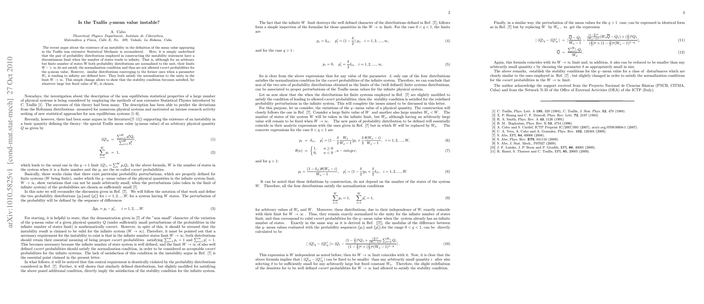 The recent argue about the existence of an instability in the definition of the mean value appearing in the Tsallis non extensive Statistical Mechanic is reconsidered. Here, it is simply underlined that the pair of probability distributions employed in constructing the instability statement have a discontinuous limit when the number of states tends to infinity. That is, although for an arbitrary but finite number of states W, both probability distributions are normalized to the unit, their limits W tending to infinity do not satisfy the normalization condition and thus are not allowed "escort" probabilities for the q-mean value. However, similar distributions converging to the former ones when a parameter W_o is tending to infinity are defined here. They both satisfy the normalization to the unity in the limit W tending to infinity. This simple change allows to show that the stability condition becomes satisfied, for whatever large but fixed value of W_o is chosen.