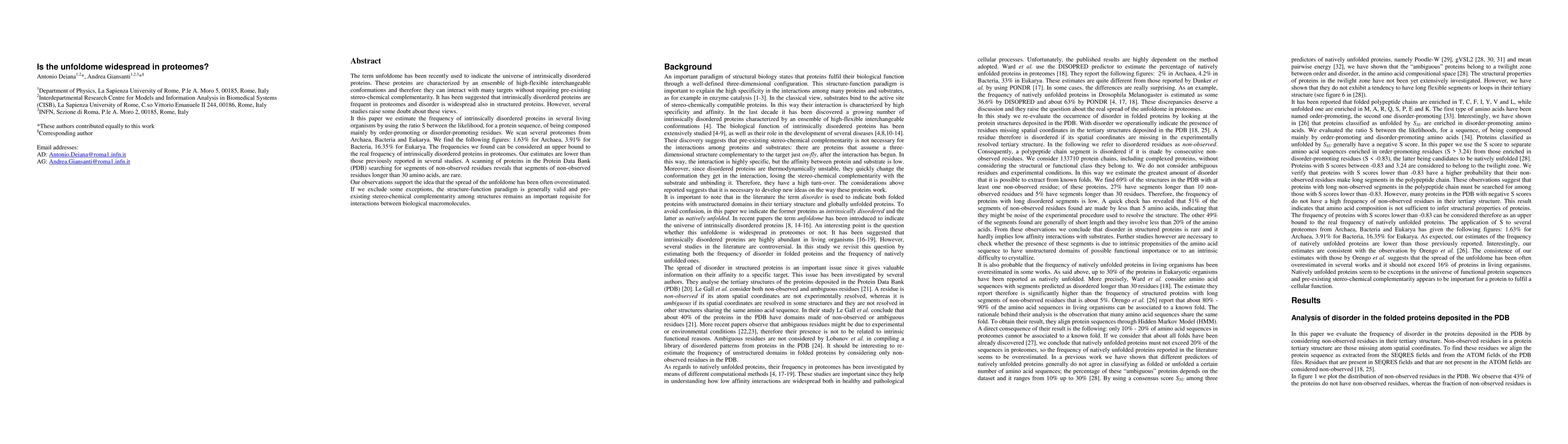 The term unfoldome has been recently used to indicate the universe of intrinsically disordered proteins. These proteins are characterized by an ensemble of high-flexible interchangeable conformations and therefore they can interact with many targets without requiring pre-existing stereo-chemical complementarity. It has been suggested that intrinsically disordered proteins are frequent in proteomes and disorder is widespread also in structured proteins. However, several studies raise some doubt about these views. It this paper we estimate the frequency of intrinsically disordered proteins in several living organisms by using the ratio S between the likelihood, for a protein sequence, of being composed mainly by order-promoting or disorder-promoting residues. We scan several proteomes from Archaea, Bacteria and Eukarya. We find the following figures: 1.63% for Archaea, 3.91% for Bacteria, 16.35% for Eukarya. The frequencies we found can be considered an upper bound to the real frequency of intrinsically disordered proteins in proteomes. Our estimates are lower than those previously reported in several studies. A scanning of proteins in the Protein Data Bank (PDB) searching for segments of non-observed residues reveals that segments of non-observed residues longer than 30 amino acids, are rare. Our observations support the idea that the spread of the unfoldome has been often overestimated. If we exclude some exceptions, the structure-function paradigm is generally valid and pre-existing stereo-chemical complementarity among structures remains an important requisite for interactions between biological macromolecules.