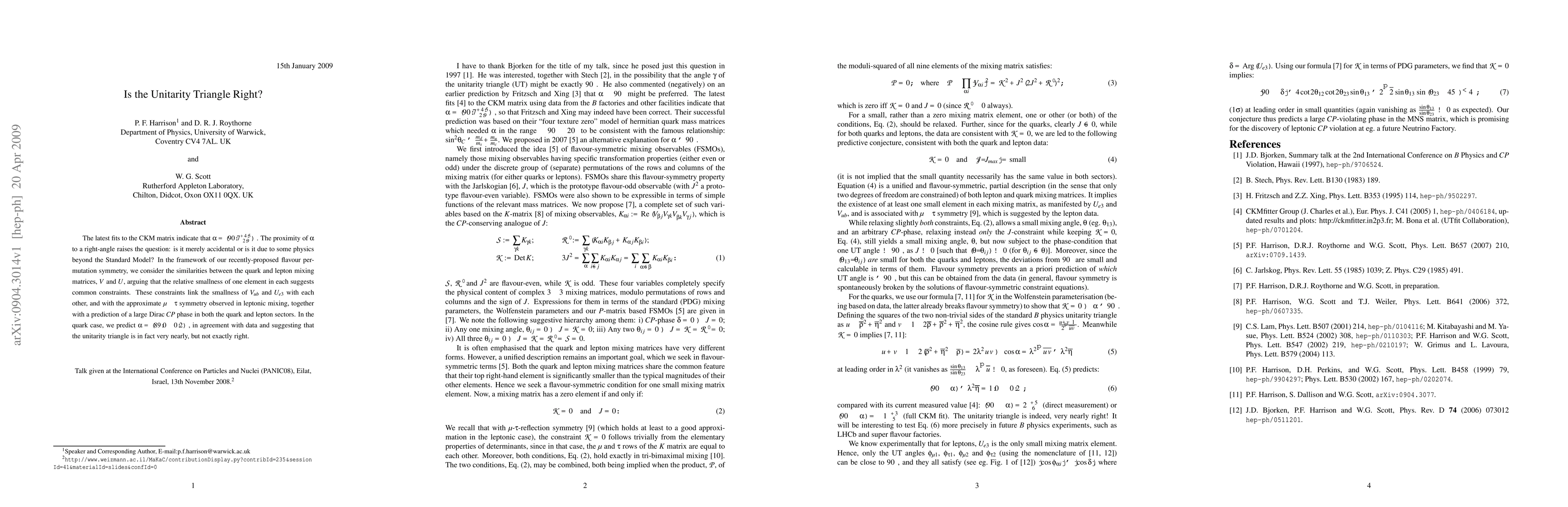 The research paper proposes a flavor permutation symmetry that predicts the unitarity triangle is nearly right at 89 degrees, in agreement with recent data, suggesting physics beyond the Standard Model.