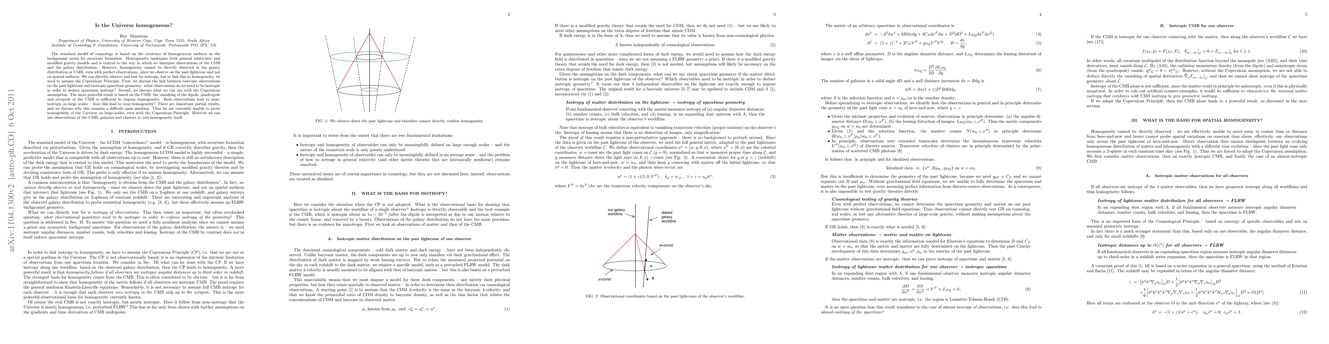 The paper explores the assumption of homogeneity in cosmology, highlighting that while observations suggest near-isotropy on large scales, it remains an open question whether this implies homogeneity due to limitations in observational data and the need to assume the Copernican Principle. Current evidence from the CMB supports near-homogeneity but does not conclusively prove it.