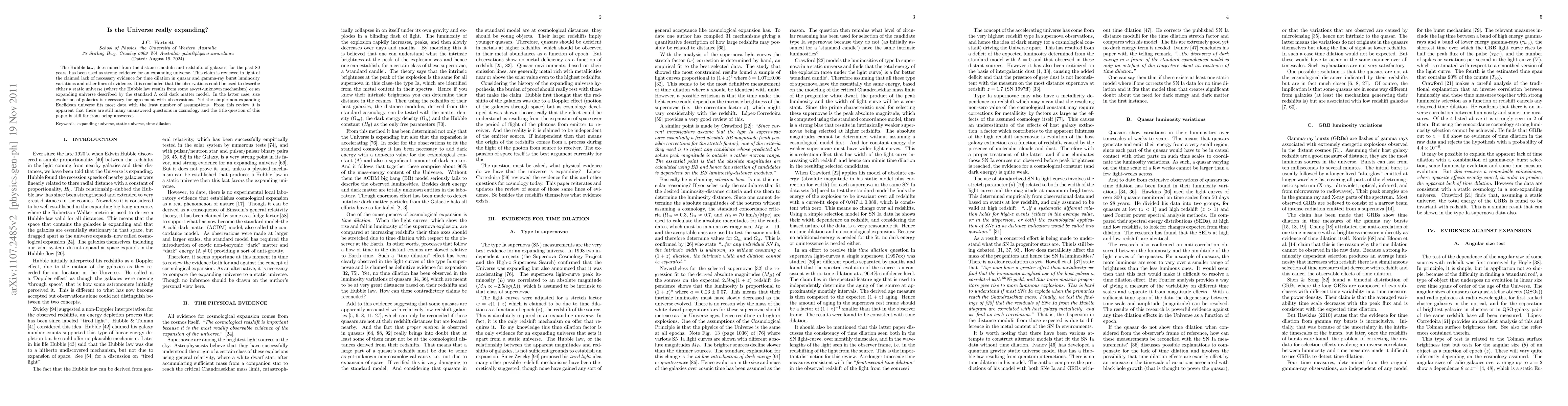 This paper reviews the evidence for the universe's expansion based on the Hubble law, but questions the necessity of time dilation and suggests that observations could fit both a static and an expanding universe model. The conclusion highlights ongoing uncertainties in cosmology.