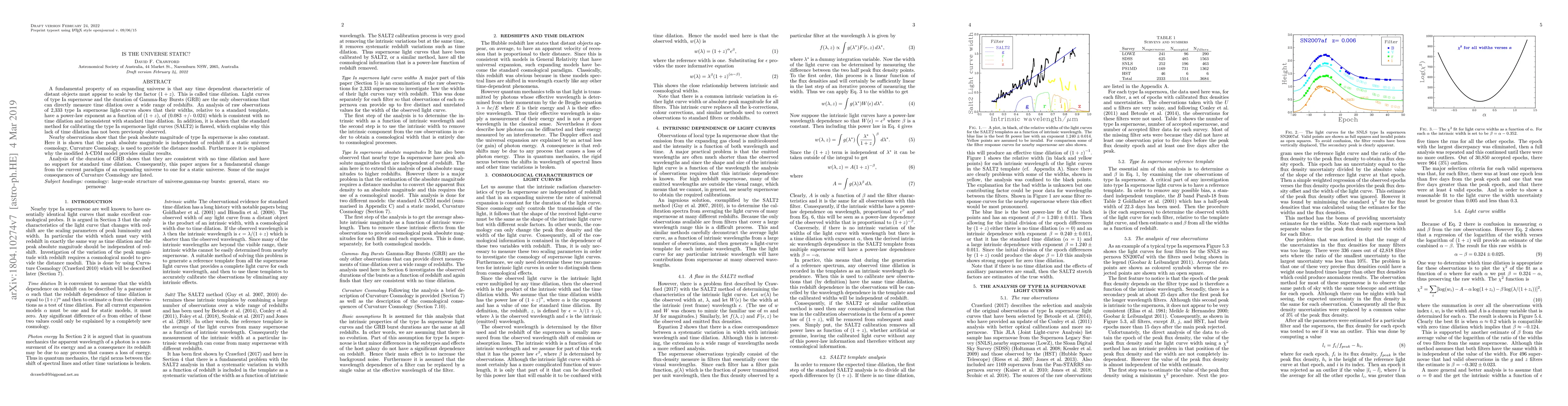 This paper argues against the standard model of an expanding universe based on observations showing no time dilation in type Ia supernovae and Gamma-Ray Bursts, suggesting instead a static universe model, Curvature Cosmology, which explains these findings. It also critiques the standard method for calibrating supernovae light curves.