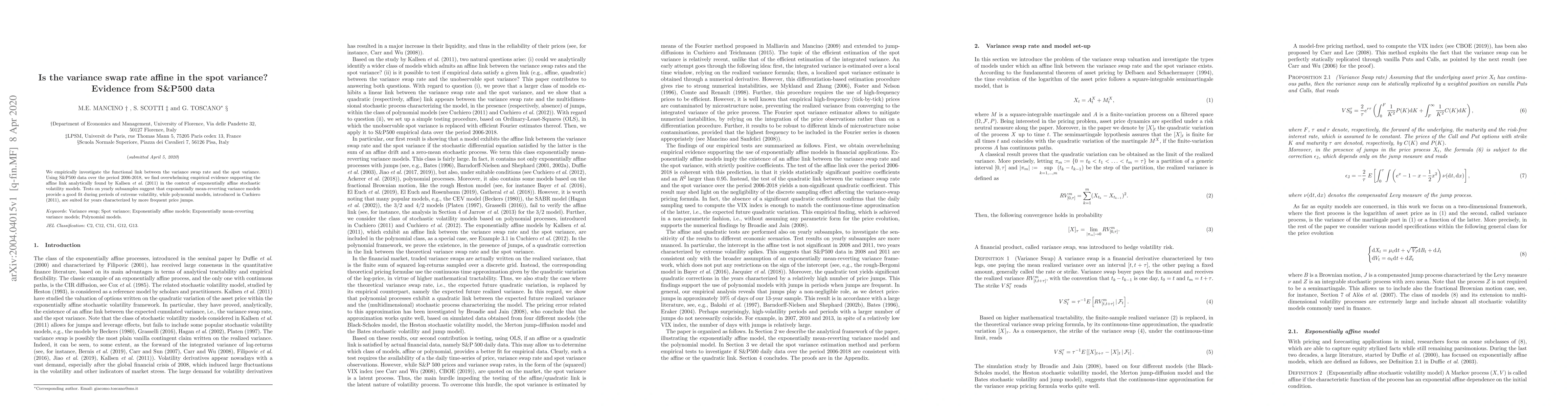 We empirically investigate the functional link between the variance swap rate and the spot variance. Using S\&P500 data over the period 2006-2018, we find overwhelming empirical evidence supporting the affine link analytically found by Kallsen et al. (2011) in the context of exponentially affine stochastic volatility models. Tests on yearly subsamples suggest that exponentially mean-reverting variance models provide a good fit during periods of extreme volatility, while polynomial models, introduced in Cuchiero (2011), are suited for years characterized by more frequent price jumps.