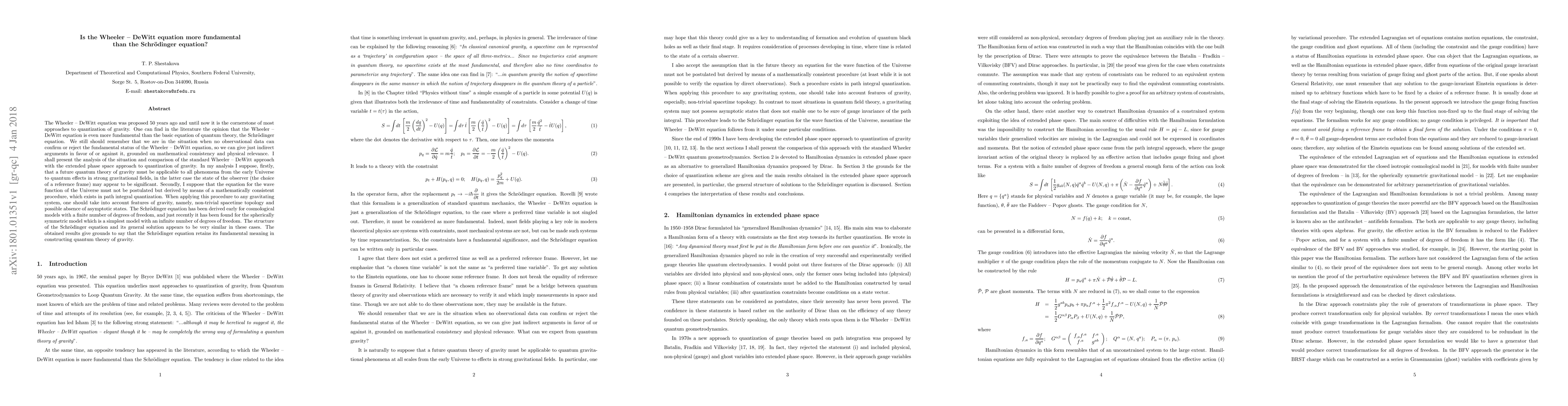 The Wheeler -- DeWitt equation was proposed 50 years ago and until now it is the cornerstone of most approaches to quantization of gravity. One can find in the literature the opinion that the Wheeler -- DeWitt equation is even more fundamental than the basic equation of quantum theory, the Schr\"odinger equation. We still should remember that we are in the situation when no observational data can confirm or reject the fundamental status of the Wheeler -- DeWitt equation, so we can give just indirect arguments in favor of or against it, grounded on mathematical consistency and physical relevance. I shall present the analysis of the situation and comparison of the standard Wheeler -- DeWitt approach with the extended phase space approach to quantization of gravity. In my analysis I suppose, firstly, that a future quantum theory of gravity must be applicable to all phenomena from the early Universe to quantum effects in strong gravitational fields, in the latter case the state of the observer may appear to be significant. Secondly, I suppose that the equation for the wave function of the Universe must not be postulated but derived by means of a mathematically consistent procedure. One should take into account features of gravity, namely, non-trivial spacetime topology and possible absence of asymptotic states. The Schr\"odinger equation has been derived early for cosmological models with a finite number of degrees of freedom, and just recently it has been found for the spherically symmetric model which is a simplest model with an infinite number of degrees of freedom. The structure of the Schr\"odinger equation and its general solution appears to be very similar in these cases. The obtained results give grounds to say that the Schr\"odinger equation retains its fundamental meaning in constructing quantum theory of gravity.