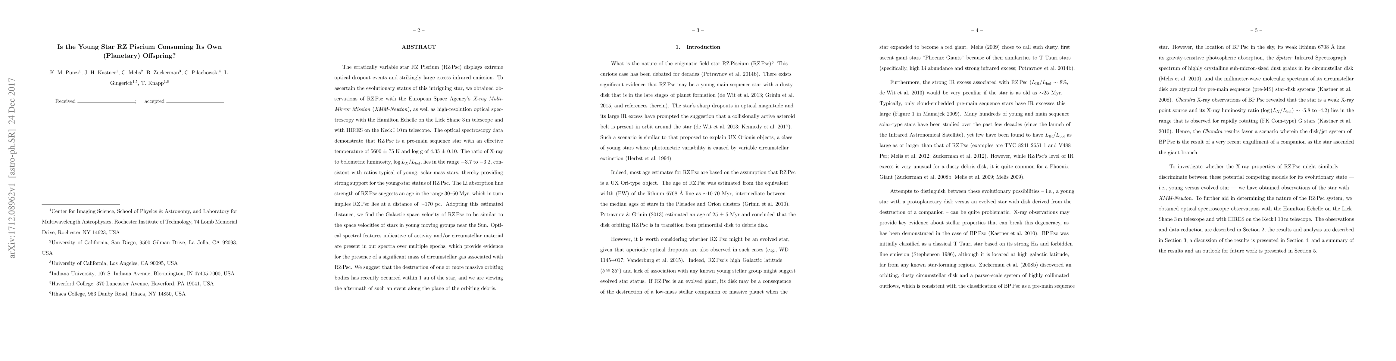 The erratically variable star RZ Piscium (RZ Psc) displays extreme optical dropout events and strikingly large excess infrared emission. To ascertain the evolutionary status of this intriguing star, we obtained observations of RZ Psc with the European Space Agency's X-ray Multi-Mirror Mission (XMM-Newton), as well as high-resolution optical spectroscopy with the Hamilton Echelle on the Lick Shane 3 m telescope and with HIRES on the Keck I 10 m telescope. The optical spectroscopy data demonstrate that RZ Psc is a pre-main sequence star with an effective temperature of 5600 $\pm$ 75 K and log g of 4.35 $\pm$ 0.10. The ratio of X-ray to bolometric luminosity, log L$_{X}$/L$_{bol}$, lies in the range -3.7 to -3.2, consistent with ratios typical of young, solar-mass stars, thereby providing strong support for the young star status of RZ Psc. The Li absorption line strength of RZ Psc suggests an age in the range 30-50 Myr, which in turn implies that RZ Psc lies at a distance of $\sim$170 pc. Adopting this estimated distance, we find the Galactic space velocity of RZ Psc to be similar to the space velocities of stars in young moving groups near the Sun. Optical spectral features indicative of activity and/or circumstellar material are present in our spectra over multiple epochs, which provide evidence for the presence of a significant mass of circumstellar gas associated with RZ Psc. We suggest that the destruction of one or more massive orbiting bodies has recently occurred within 1 au of the star, and we are viewing the aftermath of such an event along the plane of the orbiting debris.