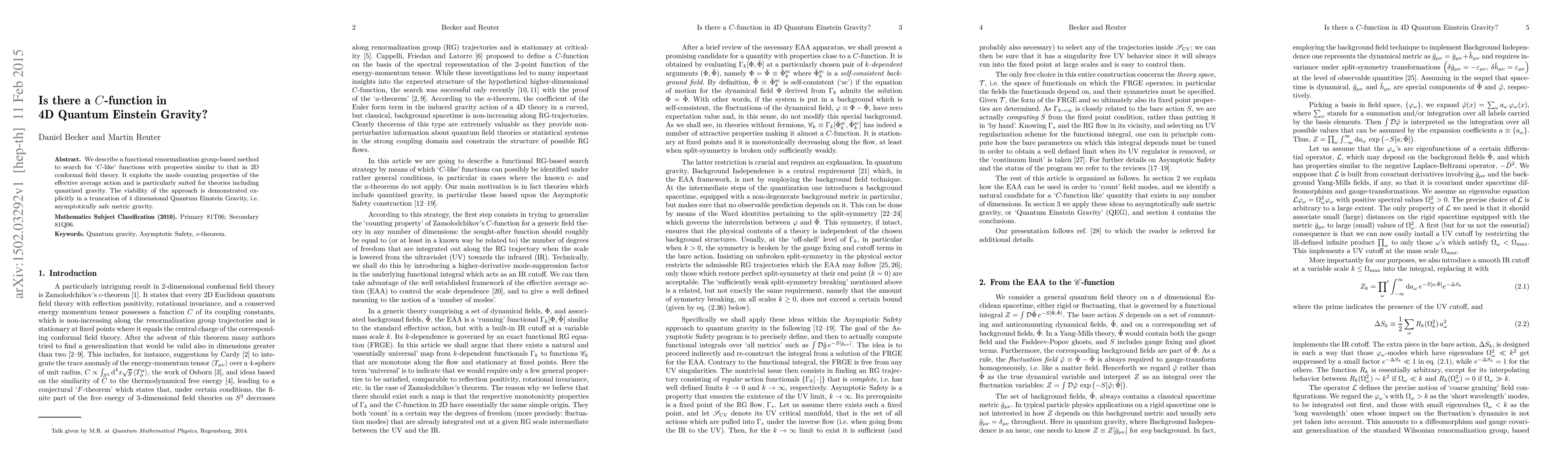 We describe a functional renormalization group-based method to search for `$C$-like' functions with properties similar to that in 2D conformal field theory. It exploits the mode counting properties of the effective average action and is particularly suited for theories including quantized gravity. The viability of the approach is demonstrated explicitly in a truncation of 4 dimensional Quantum Einstein Gravity, i.e. asymptotically safe metric gravity.