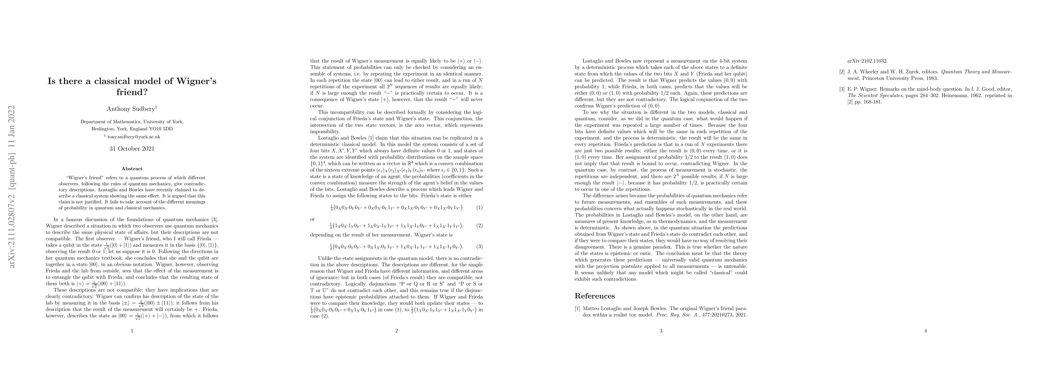 This paper argues against the claim that a classical system can replicate the contradictory observations of "Wigner's friend" in quantum mechanics, asserting that the different interpretations of probability in classical and quantum contexts invalidate the proposed classical model.