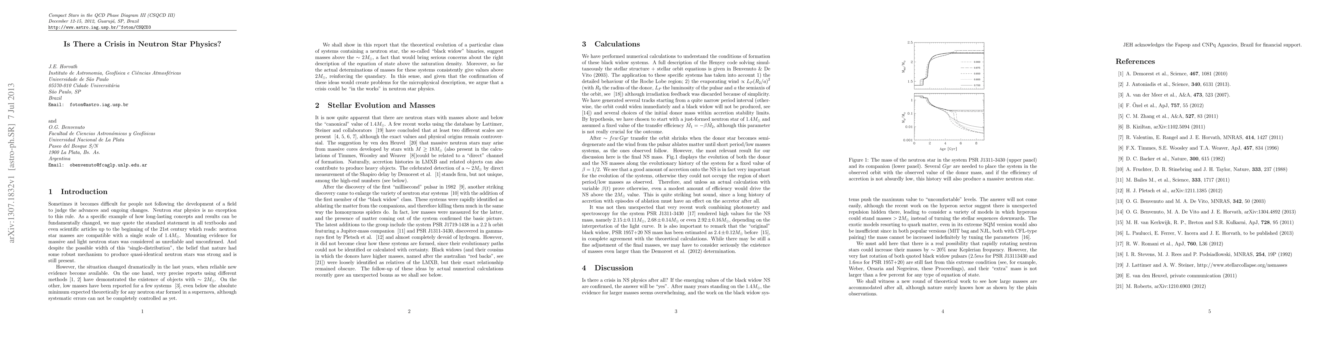 We shall show in this report that the theoretical evolution of a particular class of systems containing a neutron star, the so-called "black widow" binaries, suggest masses above the $\sim 2 M_{\odot}$, a fact that would bring serious concerns about the right description of the equation of state above the saturation density. Moreover, so far the actual determinations of masses for these systems consistently give values above $2 M_{\odot}$, reinforcing the quandary. In this sense, and given that the confirmation of these ideas would create problems for the microphysical description, we argue that a crisis could be "in the works" in neutron star physics.
