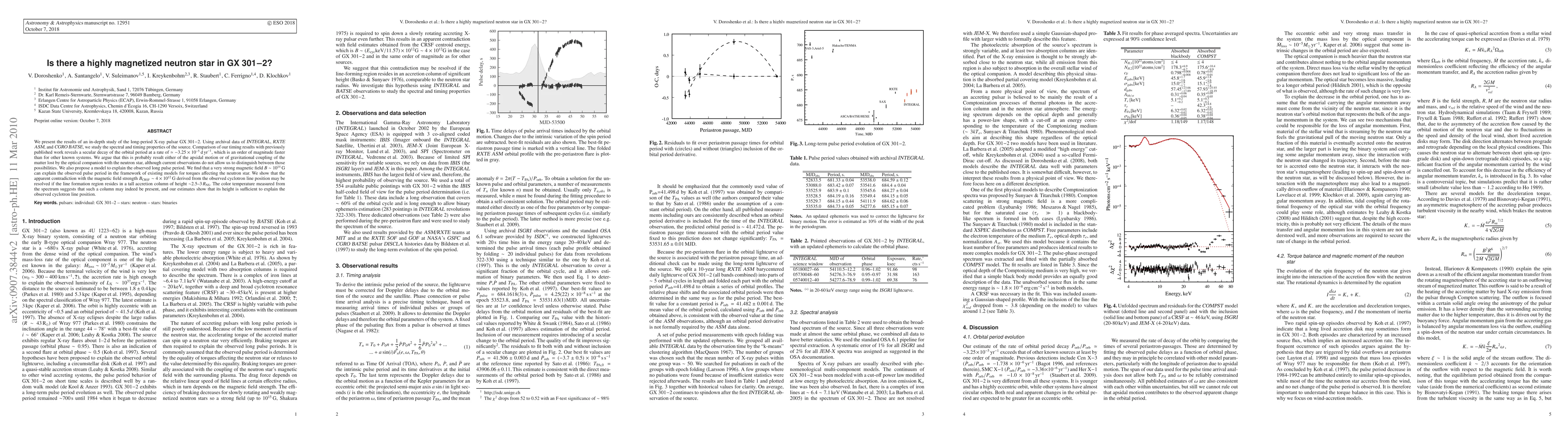 We present the results of an in-depth study of the long-period X-ray pulsar GX 301-2. Using archival data of INTEGRAL, RXTE ASM, and CGRO BATSE, we study the spectral and timing properties of the source. Comparison of our timing results with previously published work reveals a secular decay of the orbital period at a rate of \simeq -3.25 \times 10^{-5} d yr^{-1}, which is an order of magnitude faster than for other known systems. We argue that this is probably result either of the apsidal motion or of gravitational coupling of the matter lost by the optical companion with the neutron star, although current observations do not allow us to distinguish between those possibilities. We also propose a model to explain the observed long pulse period. We find that a very strong magnetic field B \sim 10^{14} G can explain the observed pulse period in the framework of existing models for torques affecting the neutron star. We show that the apparent contradiction with the magnetic field strength B_{CRSF} \sim 4 \times 10^{12} G derived from the observed cyclotron line position may be resolved if the line formation region resides in a tall accretion column of height \sim 2.5 - 3 R_{NS}. The color temperature measured from the spectrum suggests that such a column may indeed be present, and our estimates show that its height is sufficient to explain the observed cyclotron line position.