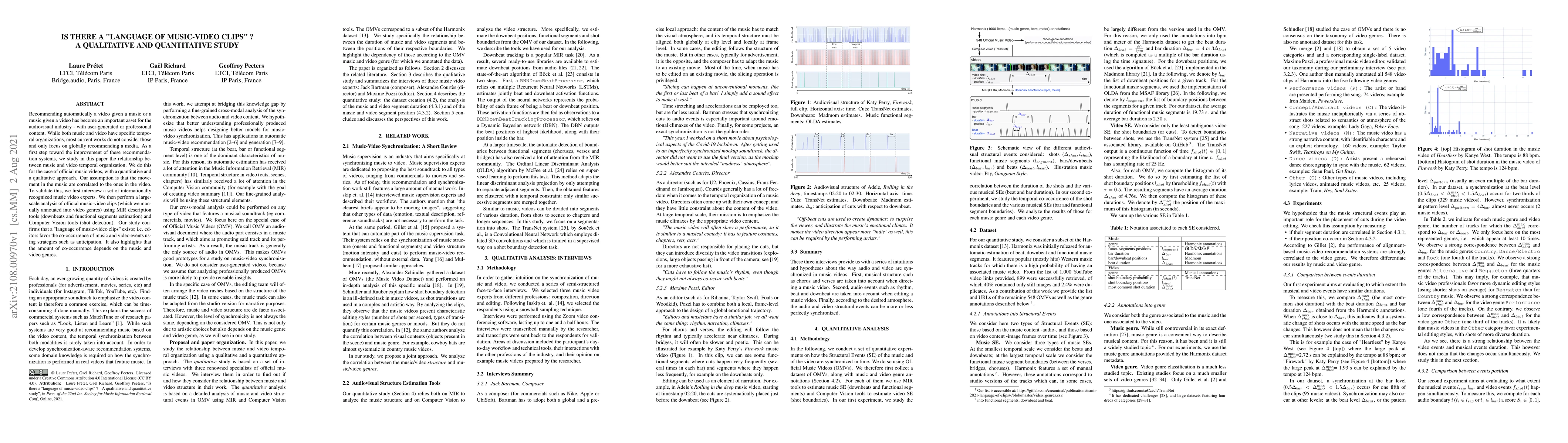This study investigates the relationship between the temporal organization of music and video in official music videos, employing both qualitative interviews with experts and quantitative analysis using music information retrieval and computer vision tools. The findings confirm the existence of a "language of music-video clips," where editors strategically align music and video events, with genre-specific variations.