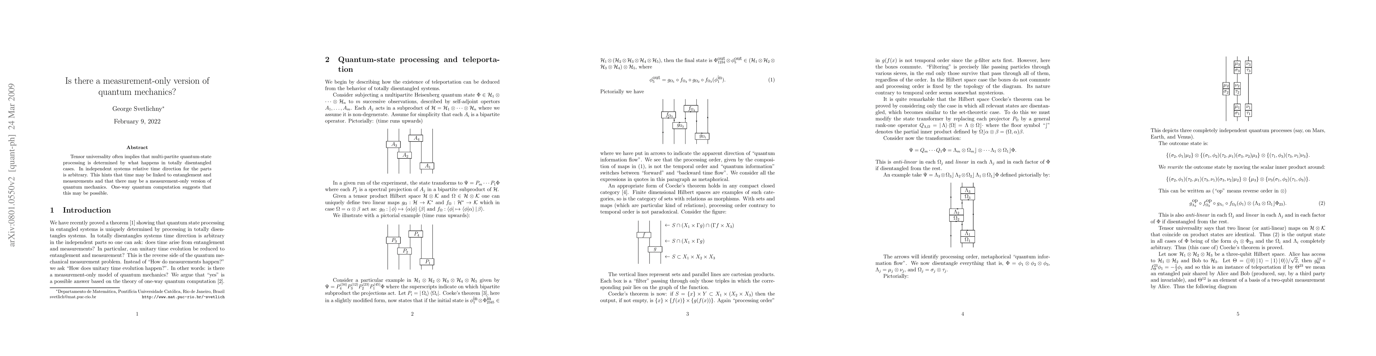 Summary: The paper explores the possibility of a measurement-only version of quantum mechanics, suggesting that tensor universality and the independence of time direction in disentangled systems imply a potential framework where time is linked to entanglement and measurements, supported by the concept of one-way quantum computation.