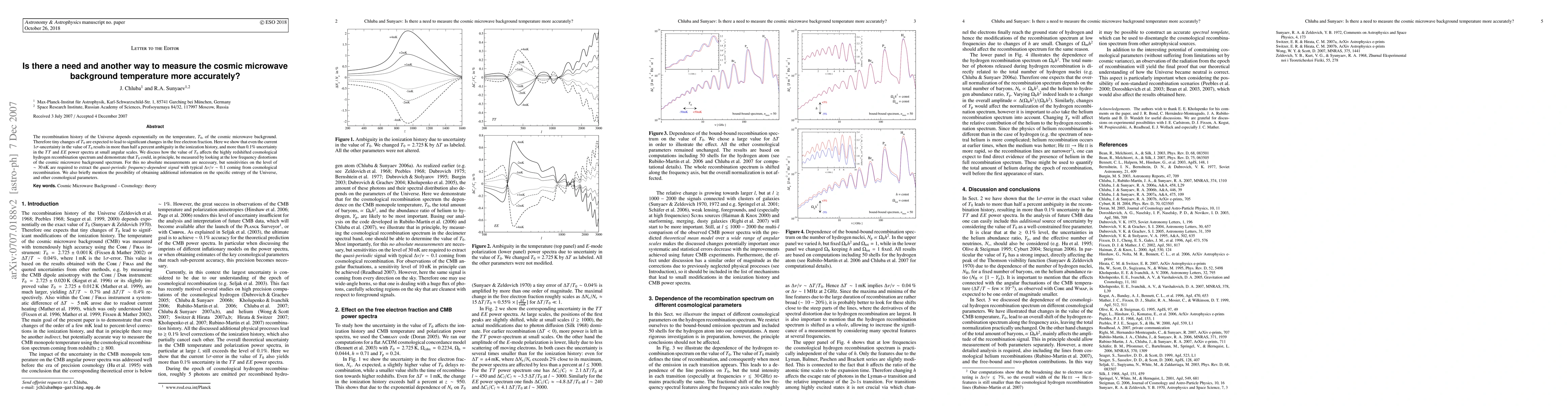 The recombination history of the Universe depends exponentially on the temperature, T_0, of the cosmic microwave background. Therefore tiny changes of T_0 are expected to lead to significant changes in the free electron fraction. Here we show that even the current 1sigma-uncertainty in the value of T_0 results in more than half a percent ambiguity in the ionization history, and more than 0.1% uncertainty in the TT and EE power spectra at small angular scales. We discuss how the value of T_0 affects the highly redshifted cosmological hydrogen recombination spectrum and demonstrate that T_0 could, in principle, be measured by looking at the low frequency distortions of the cosmic microwave background spectrum. For this no absolute measurements are necessary, but sensitivities on the level of ~30nK are required to extract the quasi-periodic frequency-dependent signal with typical Delta nu/nu~0.1 coming from cosmological recombination. We also briefly mention the possibility of obtaining additional information on the specific entropy of the Universe, and other cosmological parameters.