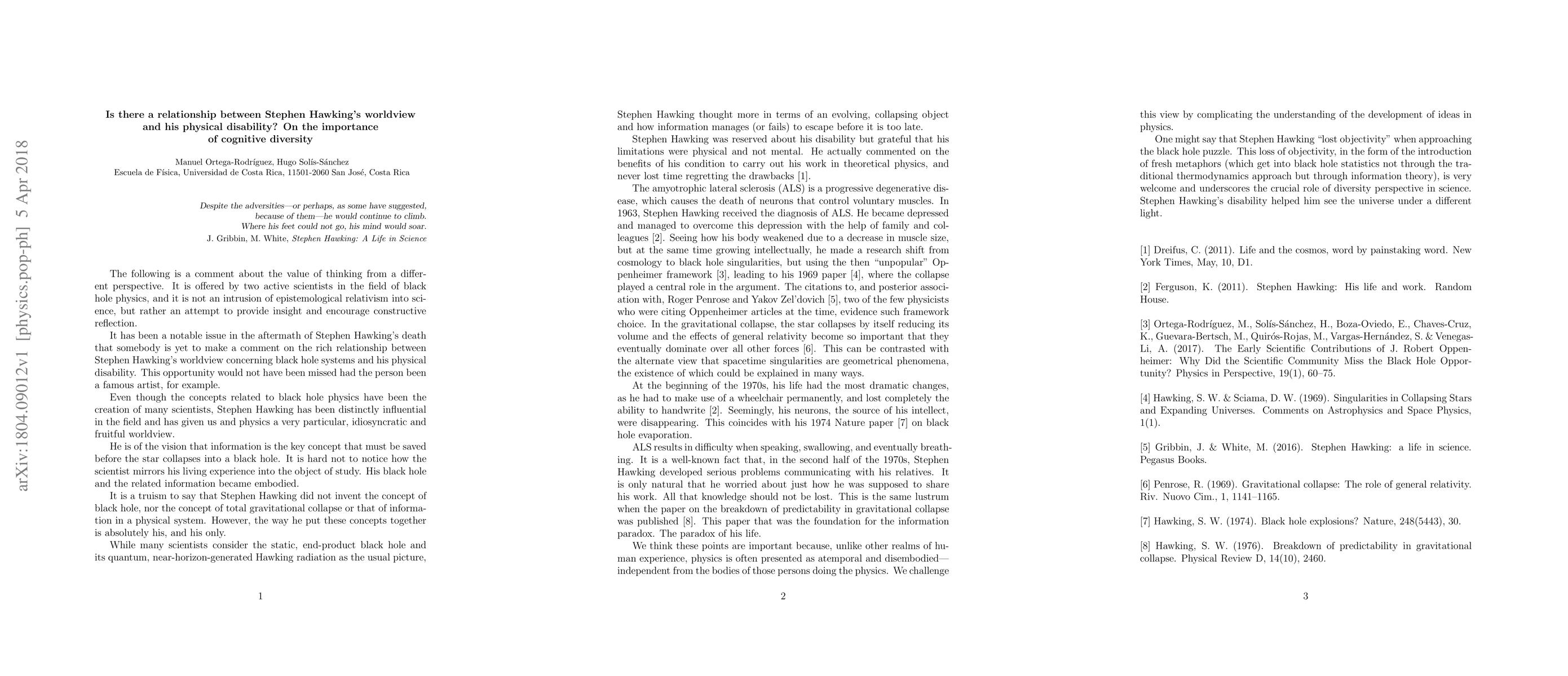 We tackle the question of whether there is a relationship between Stephen Hawking's disability and his ideas on the physics of black holes. The issue is relevant as it underscores the importance of diversity perspective in science.