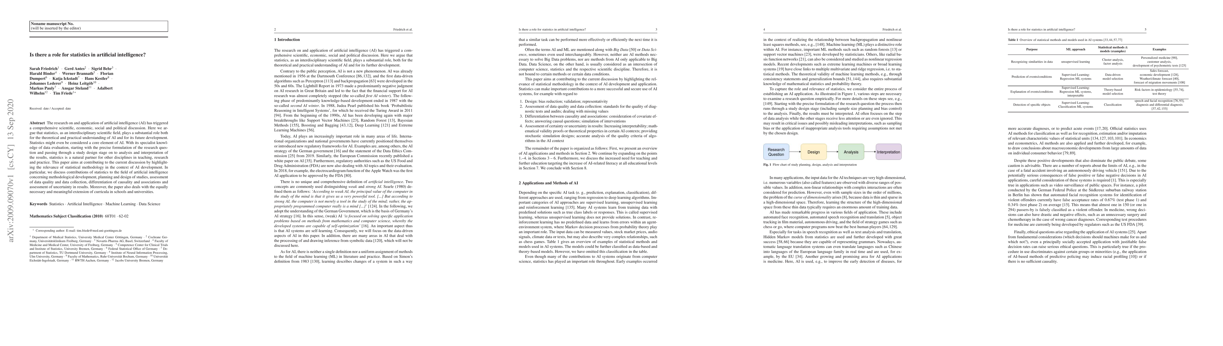 The research on and application of artificial intelligence (AI) has triggered a comprehensive scientific, economic, social and political discussion. Here we argue that statistics, as an interdisciplinary scientific field, plays a substantial role both for the theoretical and practical understanding of AI and for its future development. Statistics might even be considered a core element of AI. With its specialist knowledge of data evaluation, starting with the precise formulation of the research question and passing through a study design stage on to analysis and interpretation of the results, statistics is a natural partner for other disciplines in teaching, research and practice. This paper aims at contributing to the current discussion by highlighting the relevance of statistical methodology in the context of AI development. In particular, we discuss contributions of statistics to the field of artificial intelligence concerning methodological development, planning and design of studies, assessment of data quality and data collection, differentiation of causality and associations and assessment of uncertainty in results. Moreover, the paper also deals with the equally necessary and meaningful extension of curricula in schools and universities.