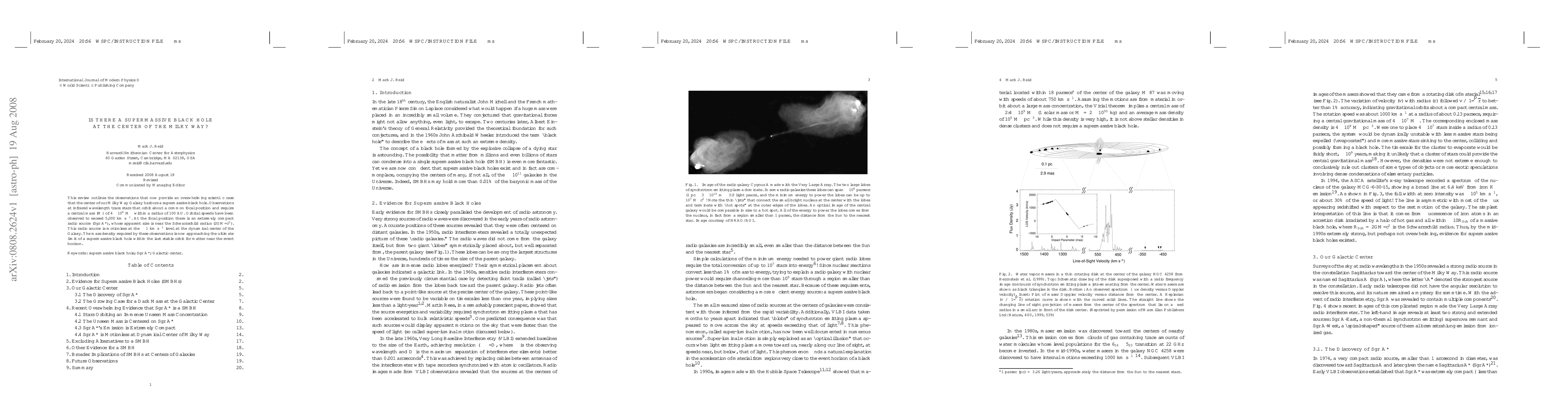 This paper reviews evidence supporting the existence of a supermassive black hole at the center of the Milky Way, with observations indicating a central mass of 4 million solar masses and a compact radio source, Sgr A*, near the Schwarzschild radius. The high orbital speeds of stars and the immobility of Sgr A* reinforce the conclusion.