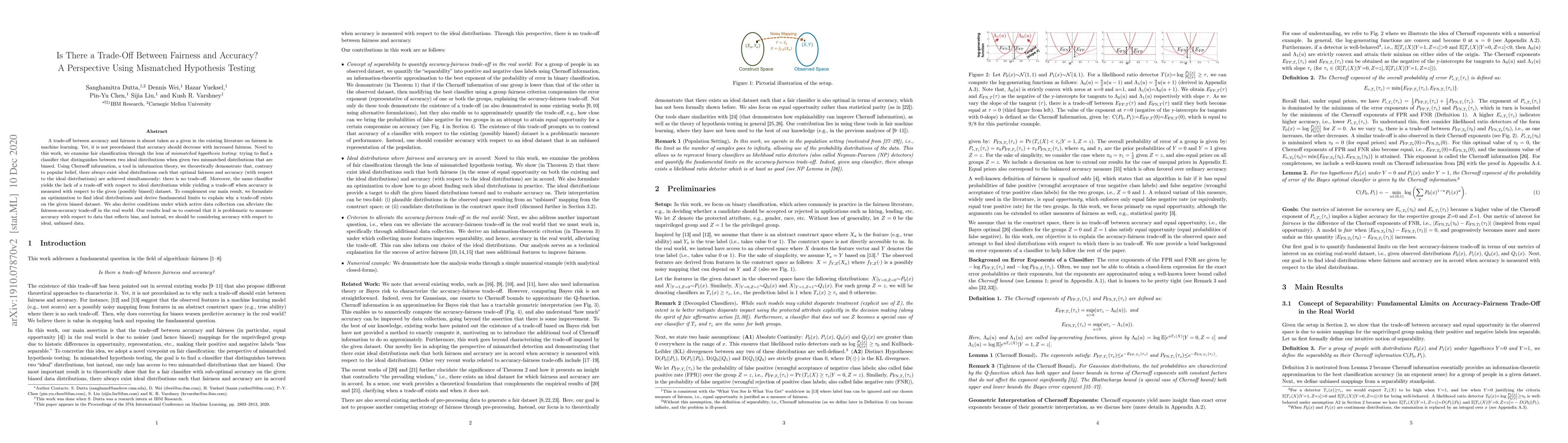 This paper argues that the commonly accepted trade-off between fairness and accuracy in machine learning is not inevitable. Using mismatched hypothesis testing and Chernoff information, it demonstrates that optimal fairness and accuracy can coexist when evaluated against ideal, unbiased data, challenging the notion that fairness must come at the expense of accuracy.