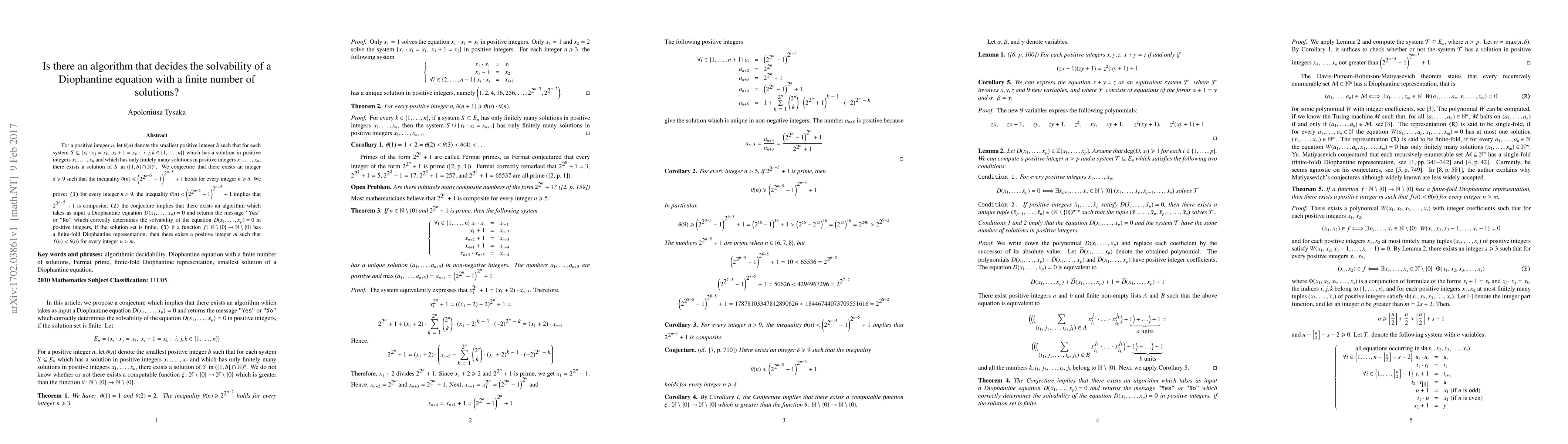 This paper investigates the existence of an algorithm to decide the solvability of Diophantine equations with a finite number of solutions. It introduces the function u03b8(n) and conjectures its upper bound, linking it to a hypothetical algorithm for determining solvability in positive integers. The research proves several related statements, including implications for composite numbers and finite-fold Diophantine representations.