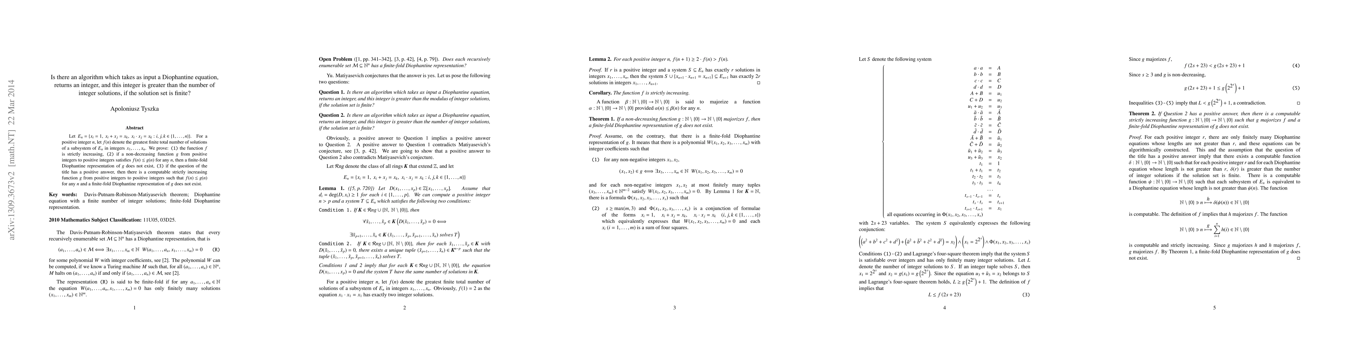 Let E_n={x_i=1, x_i+x_j=x_k, x_i \cdot x_j=x_k: i,j,k \in {1,...,n}}. For a positive integer n, let f(n) denote the greatest finite total number of solutions of a subsystem of E_n in integers x_1,...,x_n. We prove: (1) the function f is strictly increasing, (2) if a non-decreasing function g from positive integers to positive integers satisfies f(n) \geq g(n) for any n, then a finite-fold Diophantine representation of g does not exist, (3) if the question of the title has a positive answer, then there is a computable strictly increasing function g from positive integers to positive integers such that f(n) \leq g(n) for any n and a finite-fold Diophantine representation of g does not exist.