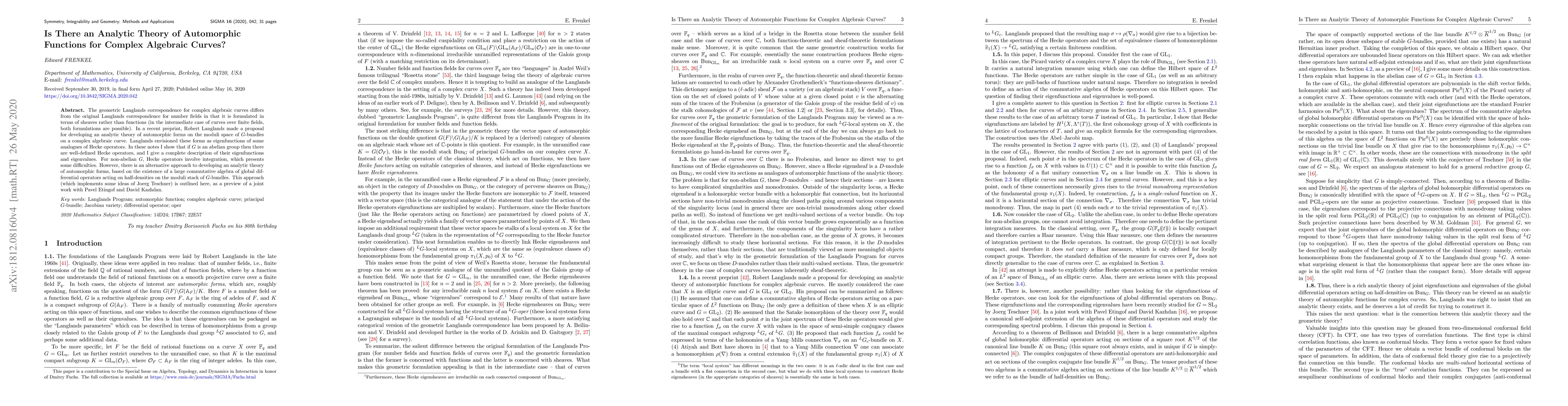 The geometric Langlands correspondence for complex algebraic curves differs from the original Langlands correspondence for number fields in that it is formulated in terms of sheaves rather than functions (in the intermediate case of curves over finite fields, both formulations are possible). In a recent preprint, Robert Langlands made a proposal for developing an analytic theory of automorphic forms on the moduli space of $G$-bundles on a complex algebraic curve. Langlands envisioned these forms as eigenfunctions of some analogues of Hecke operators. In these notes I show that if $G$ is an abelian group then there are well-defined Hecke operators, and I give a complete description of their eigenfunctions and eigenvalues. For non-abelian $G$, Hecke operators involve integration, which presents some difficulties. However, there is an alternative approach to developing an analytic theory of automorphic forms, based on the existence of a large commutative algebra of global differential operators acting on half-densities on the moduli stack of $G$-bundles. This approach (which implements some ideas of Joerg Teschner) is outlined here, as a preview of a joint work with Pavel Etingof and David Kazhdan.