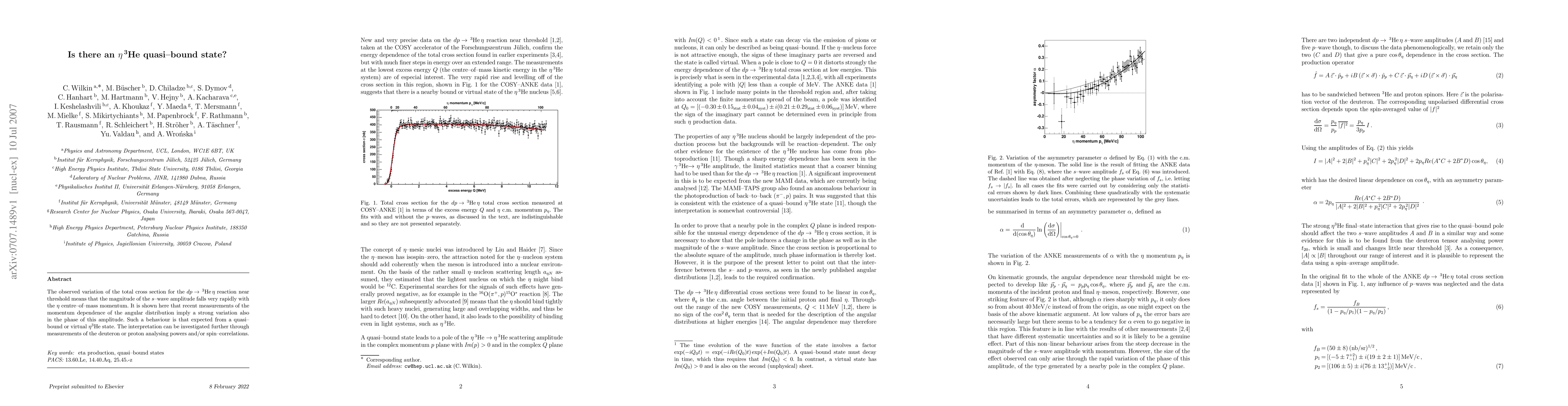 The paper suggests the existence of an eta-3He quasi-bound state based on rapid falloff and phase variation of the s-wave amplitude in dp -> 3He eta reaction near threshold. Further investigation is recommended through analyzing powers and spin-correlations measurements.