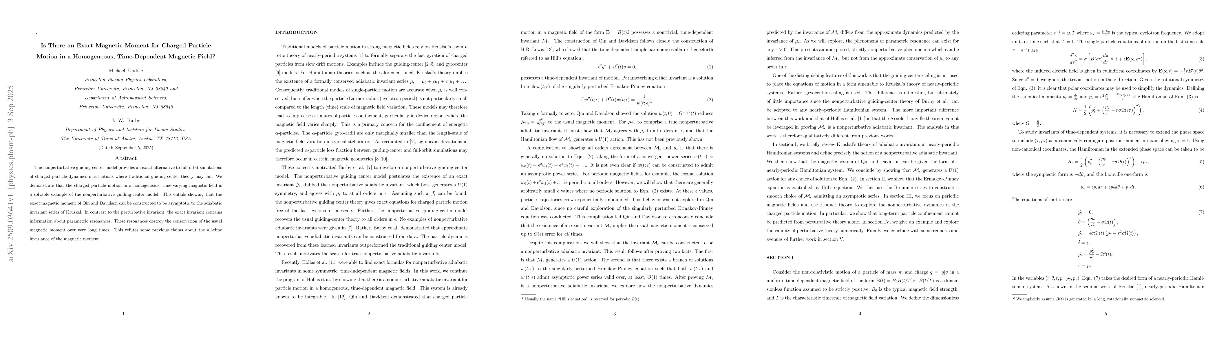 The nonperturbative guiding-center model provides an exact alternative to full-orbit simulations of charged particle dynamics in situations where traditional guiding-center theory may fail. We demonstrate that the charged particle motion in a homogeneous, time-varying magnetic field is a solvable example of the nonperturbative guiding-center model. This entails showing that the exact magnetic moment of Qin and Davidson can be constructed to be asymptotic to the adiabatic invariant series of Kruskal. In contrast to the perturbative invariant, the exact invariant contains information about parametric resonances. These resonances destroy the conservation of the usual magnetic moment over very long times. This refutes some previous claims about the all-time invariance of the magnetic moment.