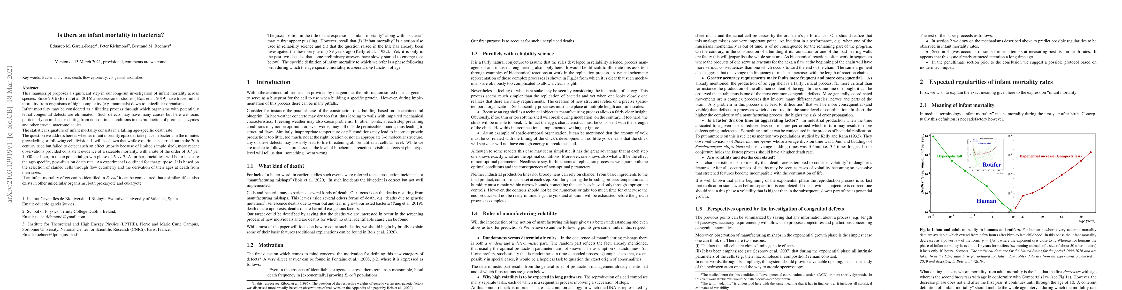 This manuscript proposes a significant step in our long-run investigation of infant mortality across species. Since 2016 (Berrut et al. 2016) a succession of studies (Bois et al. 2019) have traced infant mortality from organisms of high complexity (e.g. mammals) down to unicellular organisms. Infant mortality may be considered as a filtering process through which organisms with potentially lethal congenital defects are eliminated. Such defects may have many causes but here we focus particularly on mishaps resulting from non-optimal conditions in the production of proteins, enzymes and other crucial macromolecules. The statistical signature of infant mortality consists in a falling age-specific death rate. The question we address here is whether infant mortality episodes take place in bacteria in the minutes precededing or following cell division. It will be shown that while experiments carried out in the 20th century tried but failed to detect such an effect (mostly because of limited sample size), more recent observations provided consistent evidence of a sizeable mortality, with a rate of the order of 0.7 per 1,000 per hour, in the exponential growth phase of E. coli. A further crucial test will be to measure the age-specific, post-division death rate. An experiment is outlined for that purpose. It is based on the selection of stained cells through flow cytometry and the derivation of their ages at death from their sizes. If an infant mortality effect can be identified in E. coli it can be conjectured that a similar effect also exists in other unicellular organisms, both prokaryote and eukaryote.