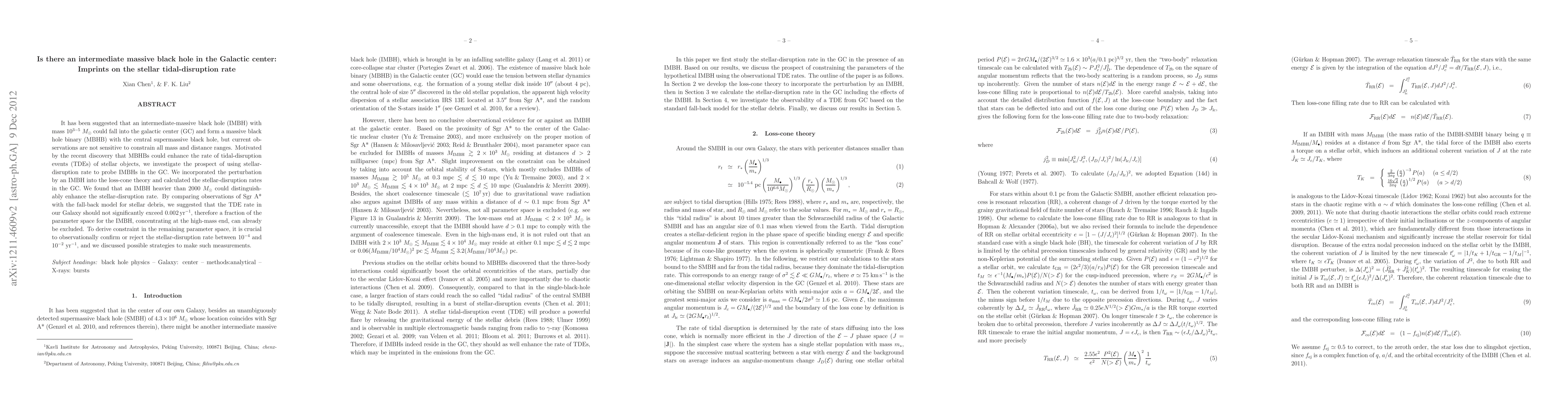 This paper investigates the potential presence of an intermediate-massive black hole (IMBH) in the Galactic center by analyzing its impact on the stellar tidal-disruption rate. The study finds that an IMBH heavier than $2000 M_\odot$ could significantly enhance the disruption rate, and suggests that the current observed TDE rate constrains the IMBH mass, indicating a need for further observations to confirm or reject rates between $10^{-4}$ and $10^{-2} yr^{-1}$.